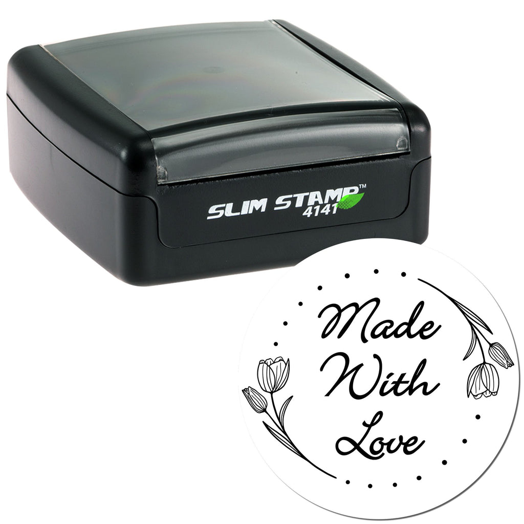Transform your handmade creations into cherished treasures with our exquisite 1-5/8" round Floral Love Seal stamp. This elegantly designed pre-inked stamp features graceful cursive lettering spelling "made with love," beautifully framed by delicate tulip illustrations and whimsical dots.