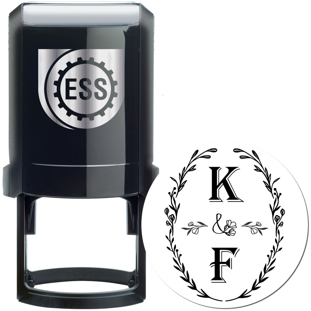 Crafted with precision, this 1-5/8" round stamper features a stunning design that showcases the letters "K" and "F" in bold, serif typography, beautifully stacked and surrounded by a symmetrical circle of delicate leaves and flowers. At the heart of this intricate design is a charming flower with the "&" sign, all enclosed within a neat, round shape. It's the perfect save the date name stamp to make your invitations and notes truly memorable.