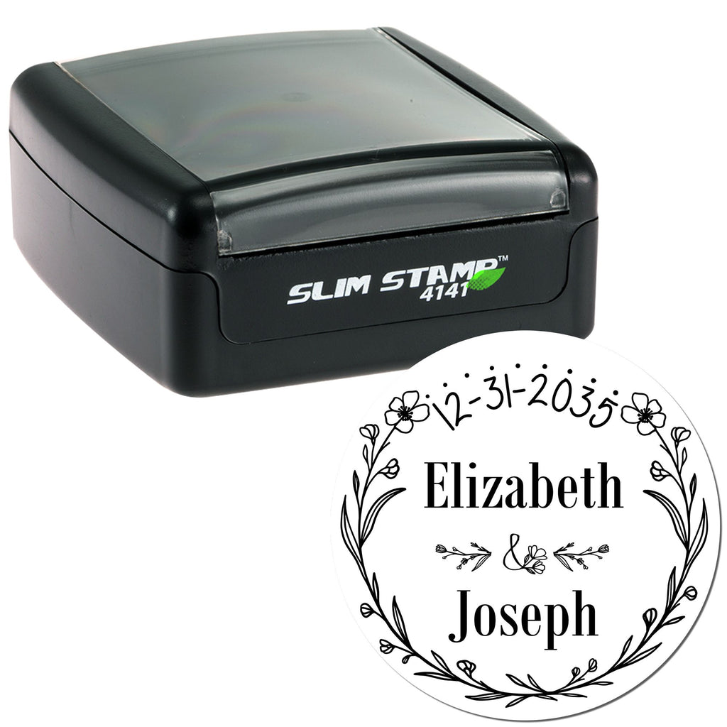 Crafted with meticulous attention to detail, this 1-5/8" round stamp features an enchanting floral wreath design encircling your chosen names and special date. The delicate hand-drawn flowers and timeless serif font create an elegant harmony that speaks of enduring love and thoughtful personalization.