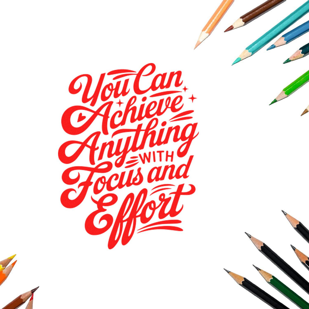 Glorious bold black-and-white typography proclaims the mantra, “You can achieve anything with focus and effort,” framed by elegant swirls and starbursts for striking impact.