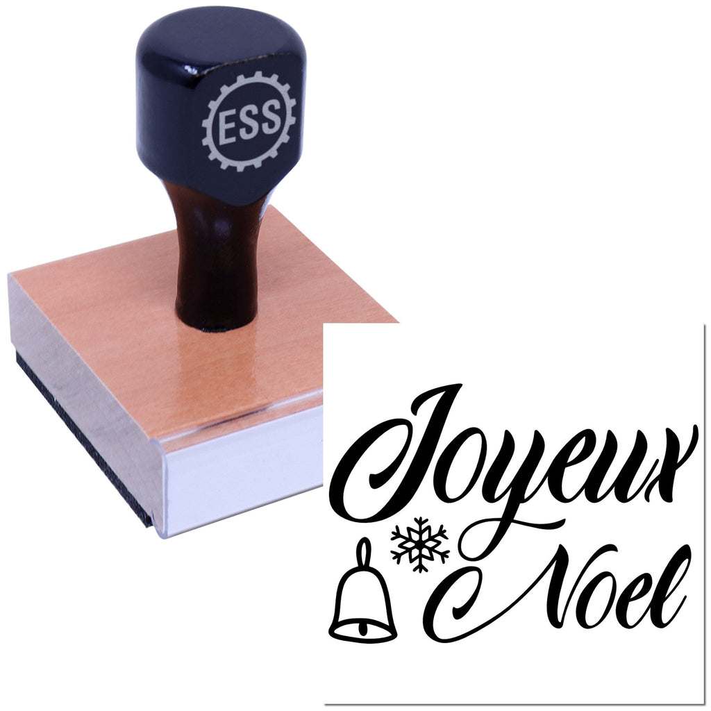 Made for bold, fast festive flair — this 1-5/8" square French Christmas rubber stamp crisply imprints a hand-lettered "Joyeux Noël" with a stylized snowflake between the words and a charming bell icon to the left, giving every card, tag, and scrapbook page a boutique look.
