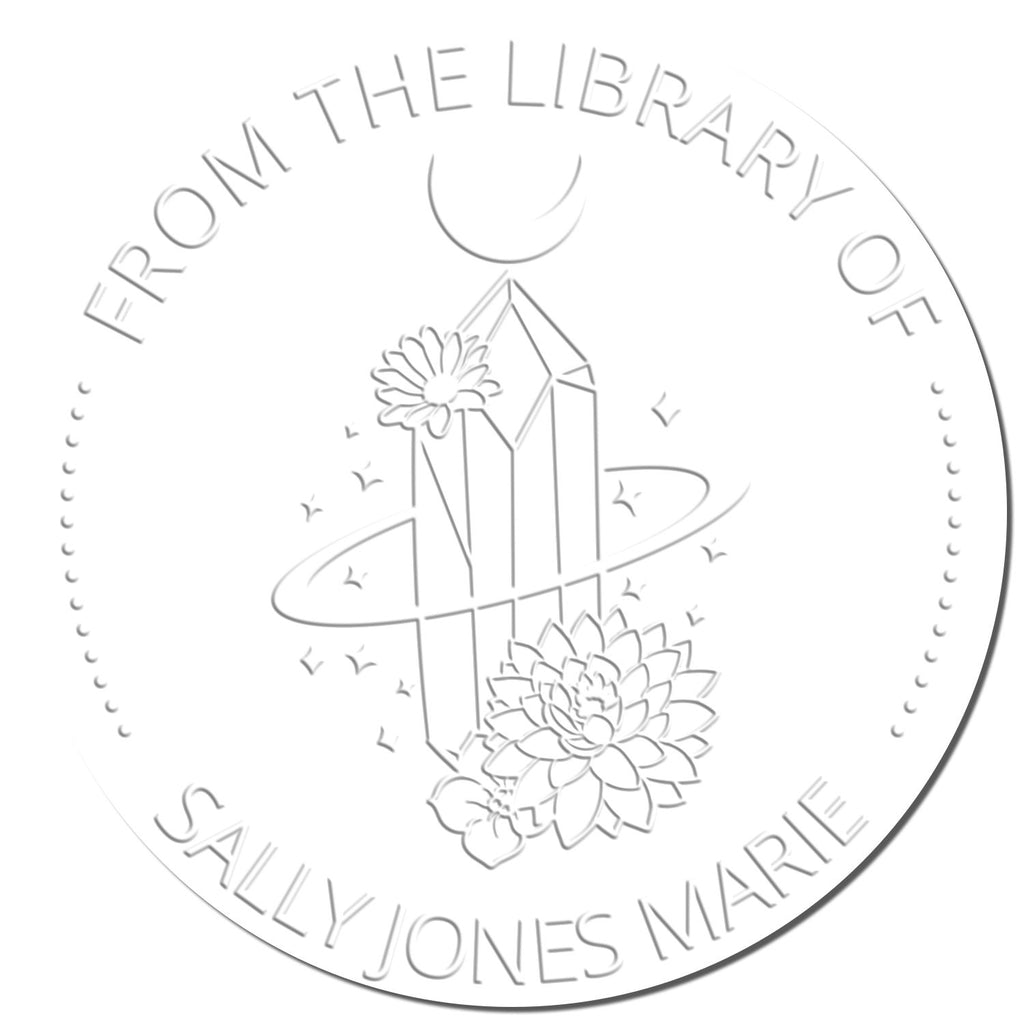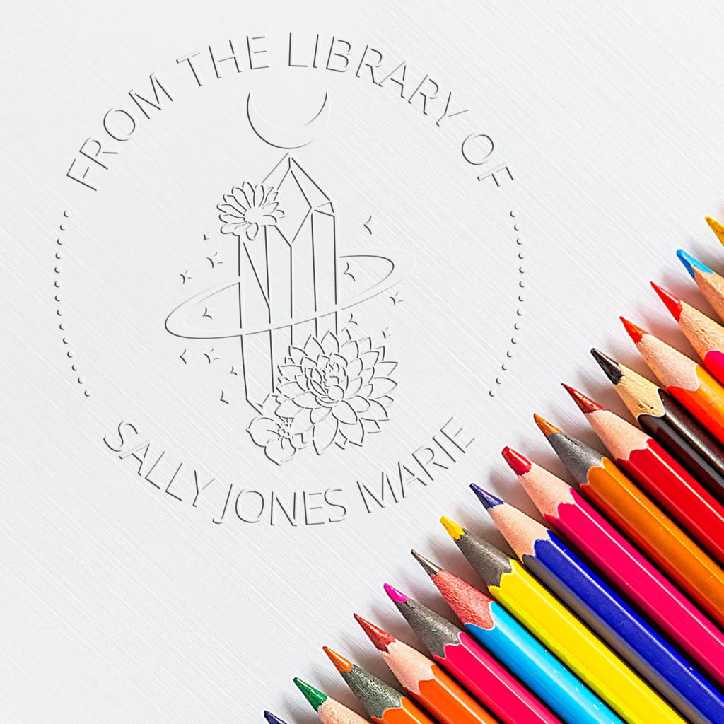 ✨ Introducing the Galadriel's Mantle Tarot Hybrid Custom-Made Ex Libris Bookplate Seal - a mystical fusion of elegance and enchantment for your cherished book collection! This exquisite 1-5/8" embosser transforms your library into a realm of wonder with its celestial design featuring a crystal centerpiece encircled by ethereal rings, adorned with twin flowers, scattered stars, and a crescent moon.