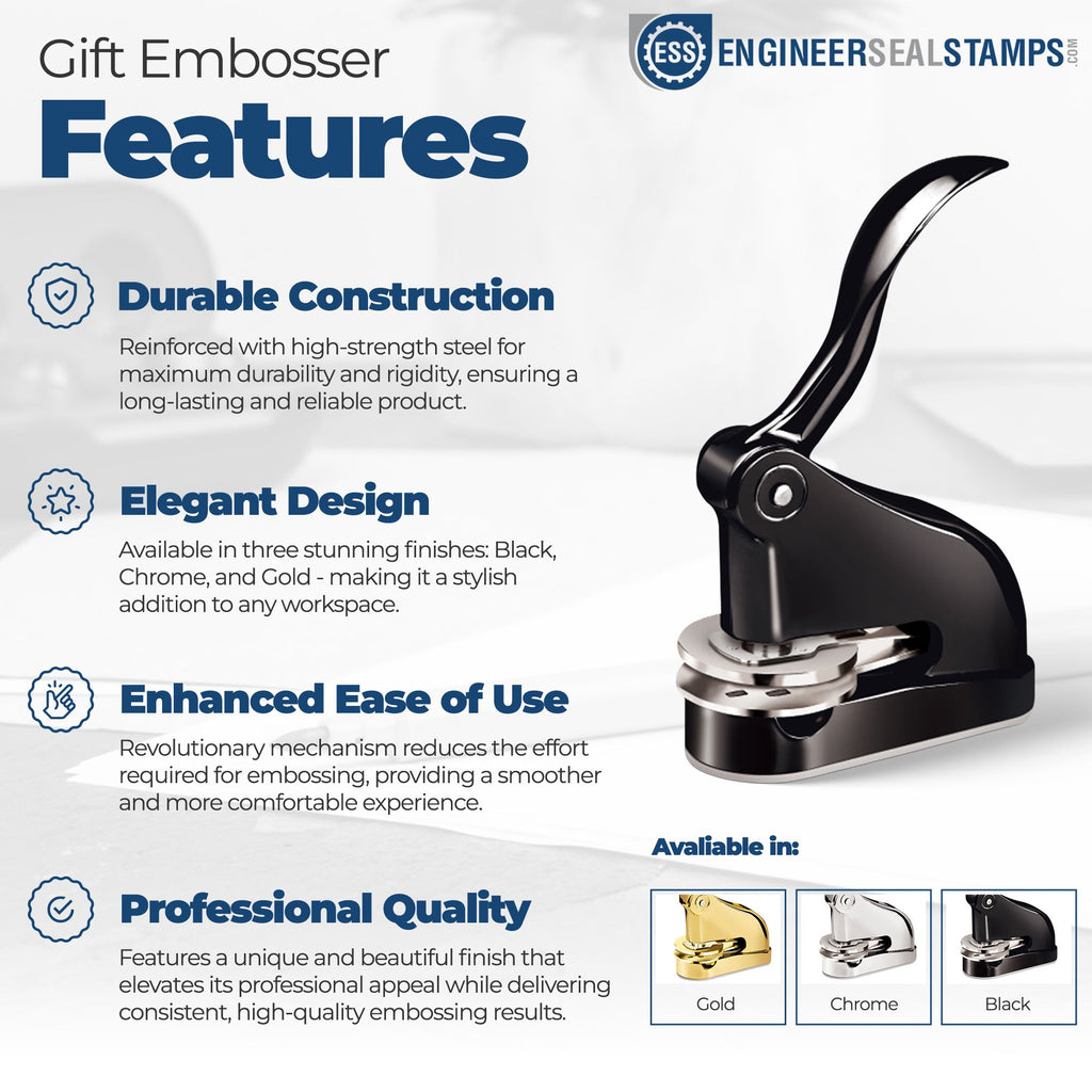 - CHIC FINISHES to match your office decor! Available in luxurious gold, chic chrome, and refined black, our embosser adds elegance to any workspace. Choose a finish that reflects your company's branding and style.