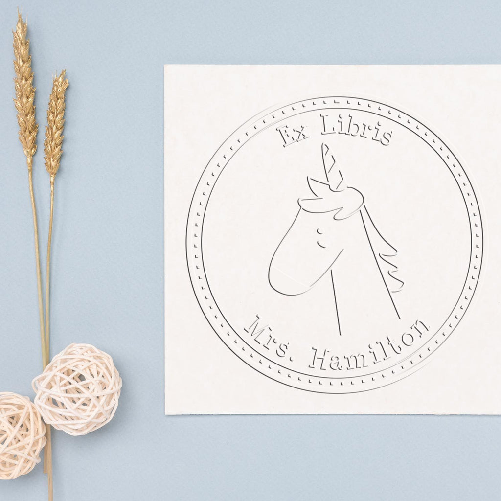 Transform your child's reading adventure with our enchanting 1-5/8" unicorn-themed book embosser, featuring an adorable black-and-white cartoonish unicorn design with a flowing mane and playful expression that captures young imaginations!