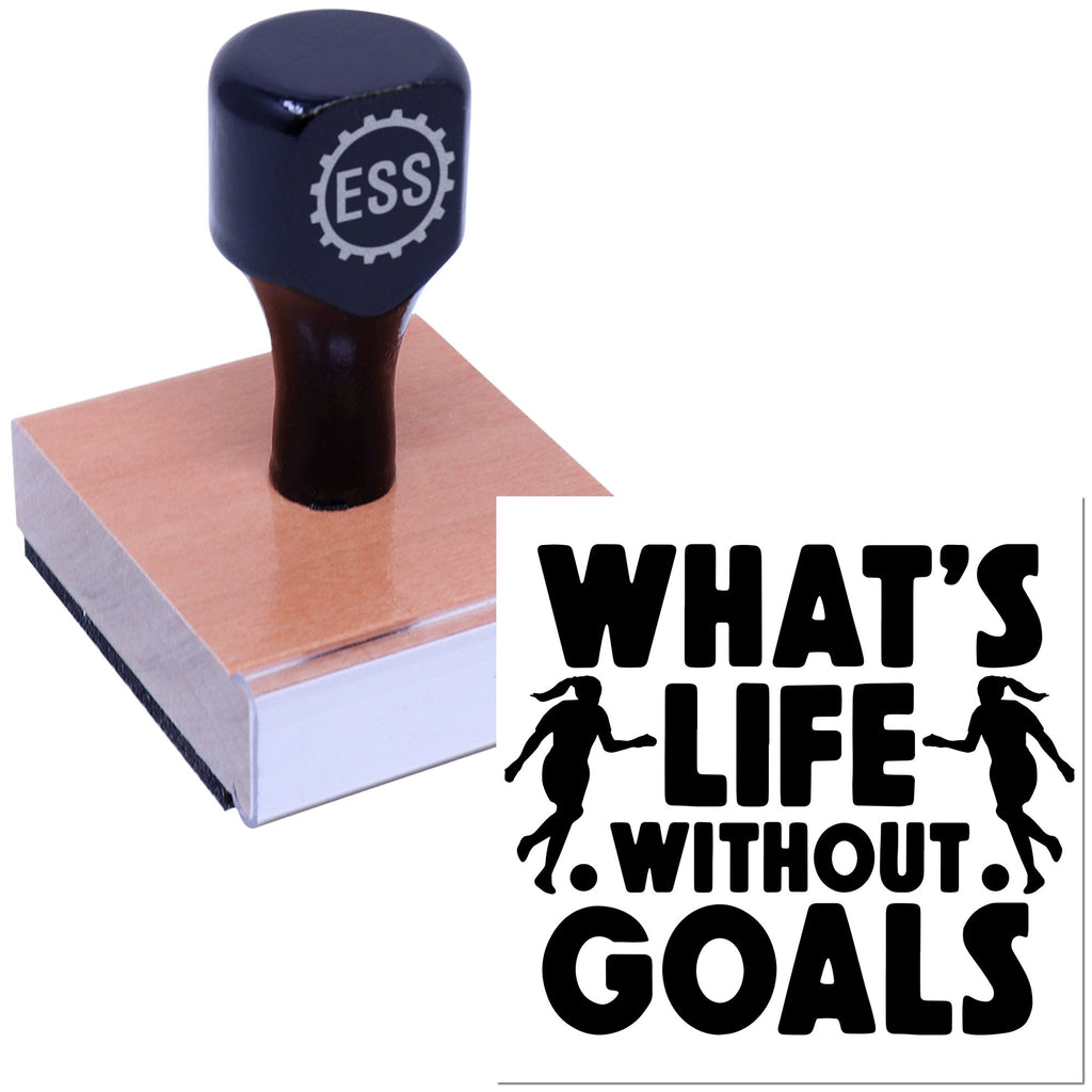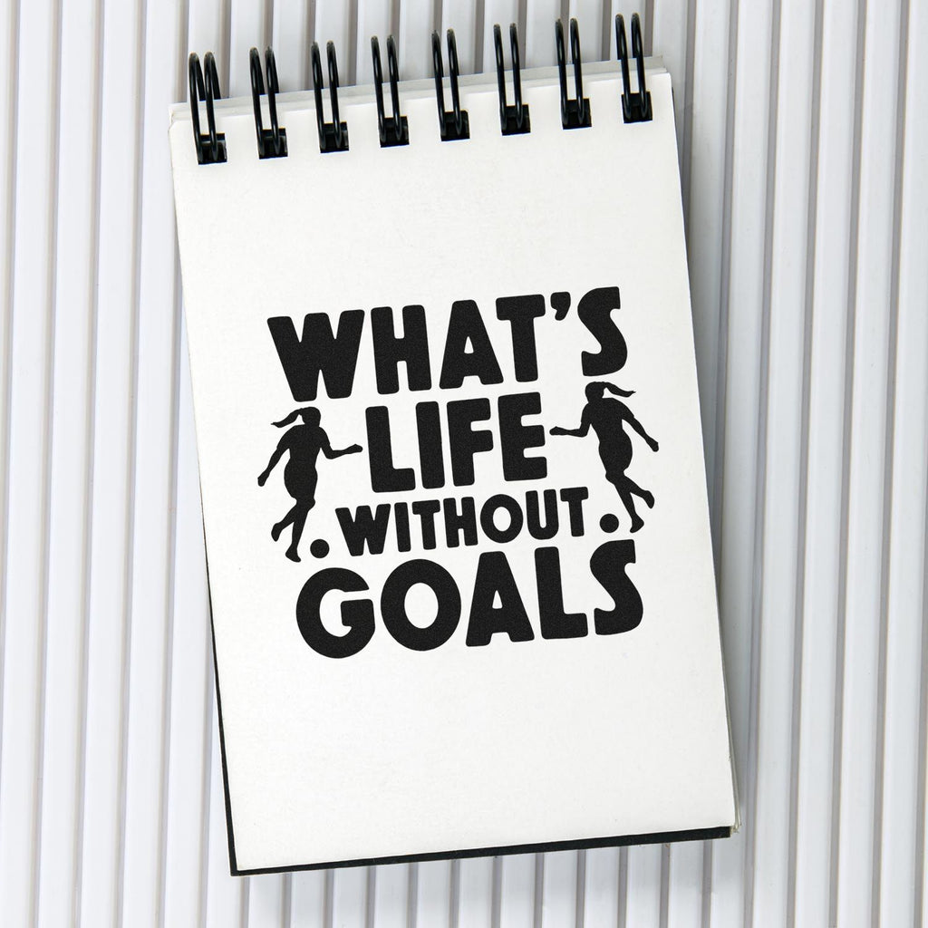 - Instant motivation: Bold black lettering “WHAT’S LIFE WITHOUT GOALS” with two female soccer silhouettes delivers a playful sports-pun vibe that connects emotionally and boosts engagement on every item.