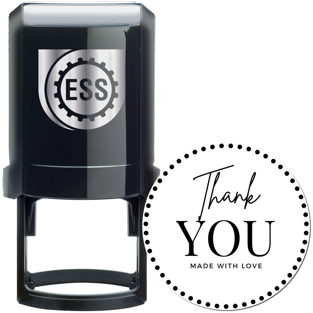 - ELEGANT DESIGN ELEMENTS: Round 1-5/8" stamp features decorative dot border and stylish "thank you" script. "MADE WITH LOVE" message adds personal touch to every impression. Perfect for artisans and small businesses.