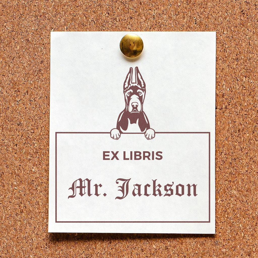 Elevate your book collection with our exclusive Great Dane Ex Libris Book Label Stamp, featuring a striking black and white illustration of a majestic Great Dane with cropped ears. This custom-made stamp combines sophistication with personality, perfect for the distinguished dog lover and bibliophile.