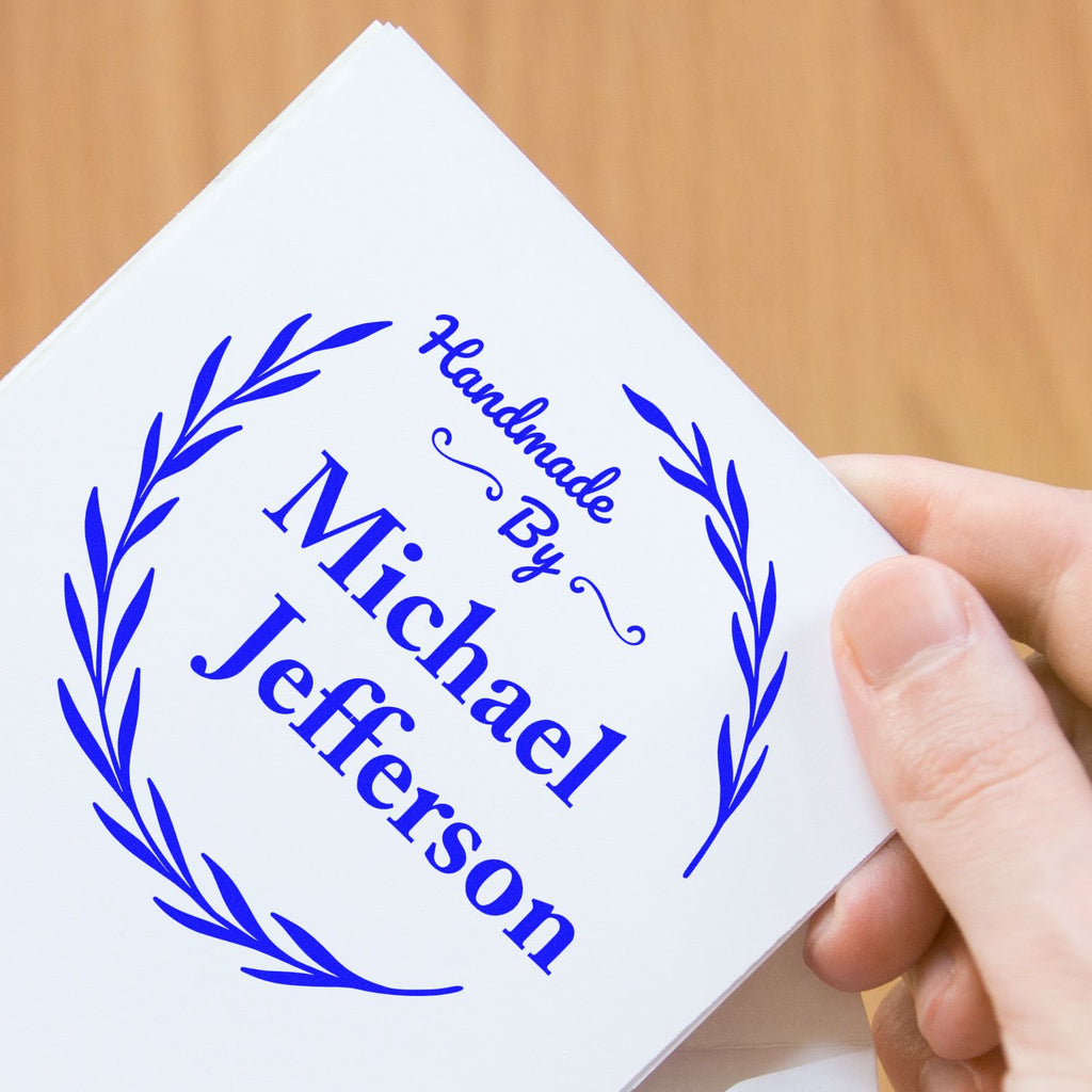 Introducing our custom stamp design: a perfect blend of classic elegance and personal touch. At the top, the words "Handmade by" are gracefully scripted in a flowing cursive font. Below, the name "Michael Jefferson" stands out in a bold, serif typeface. Delicate flourishes add a touch of charm between the two styles. Encircling the design is a laurel wreath, symbolizing sophistication and craftsmanship. This stamp offers a clean, professional, and timeless look, ideal for adding a personal signature to your handmade creations.