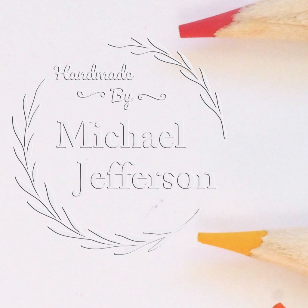 Featuring a sophisticated design with "handmade by" in elegant cursive, complemented by your name in bold serif typography, this seal makes an unforgettable impression. The decorative laurel wreath border adds a touch of timeless refinement, ensuring your mark stands out with professional distinction.