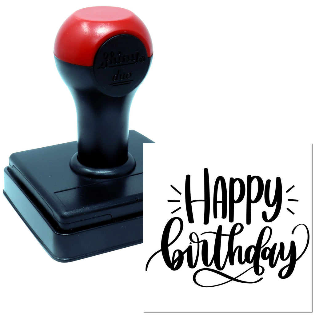 Design highlight: a striking, hand-lettered “Happy birthday” in rich black with graceful swirls, a subtle flourish, and radiant accent lines bursting from “Happy,” set to shine against bright inks or a crisp white base—perfect for eye-catching cards, party décor, and standout page titles.