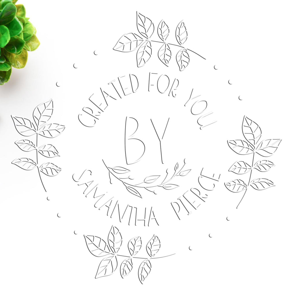 Crafted with precision, our desk embossers guarantee clear, crisp, and consistent impressions every time. Whether you're embossing certificates, letters, or special documents, each piece will carry an air of authority and elegance. The 1-5/8" round design features a chic, circular layout adorned with hand-drawn leaves and dots, framing the whimsical text "created for you by Samantha Pierce." This modern, minimalist design is perfect for those who appreciate a touch of botanical flair.