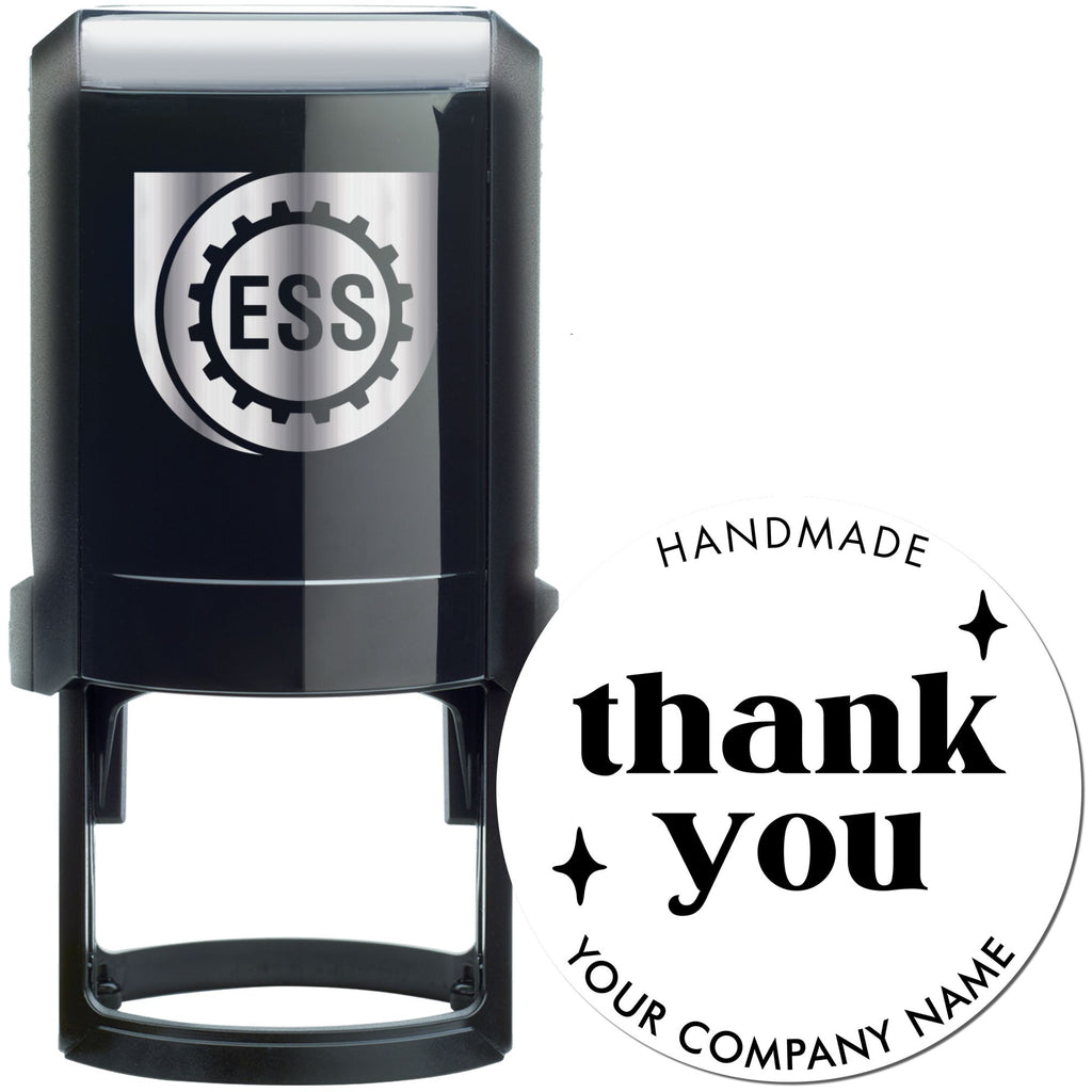 Featuring an elegant 1-5/8" round design, this professional-grade stamp showcases your gratitude in style with "HANDMADE" gracefully arched at the top, a beautifully scripted "THANK YOU" in the center adorned with decorative stars, and space for your company name below. Each impression delivers crystal-clear, professional results that will leave a lasting impression on your customers.