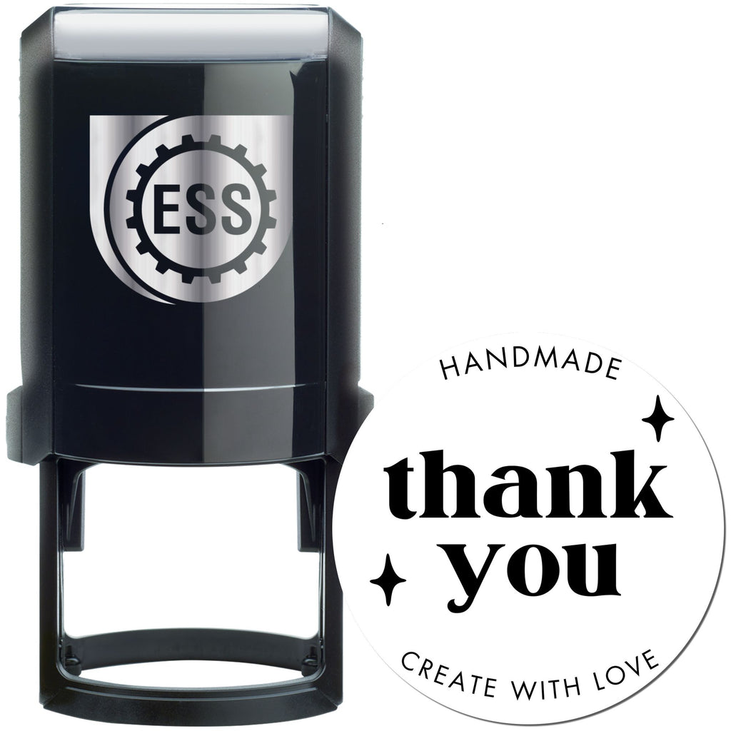 Elevate Your Thank You Notes with Our Premium Handmade Gratitude Self-Inking Stamp! Perfect for small business owners and crafters who value that personal touch. This 1-5/8" round stamp features elegant lettering with "thank you" as the centerpiece, adorned with decorative stars and complemented by "handmade" and "create with love" text.