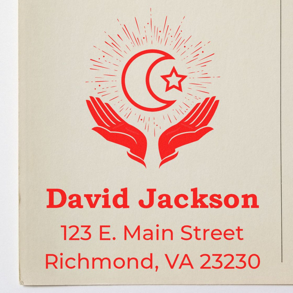 Introducing the Hands of Prayer Customized Address Stamp Elevate your correspondence with our exquisite Hands of Prayer Customized Address Stamp! This unique and meaningful stamp is not just a tool; it’s a reflection of your faith and values. Perfect for religious individuals and families who want to add a personal touch to their mail, this stamp features a beautifully designed image of hands in prayer, accompanied by a crescent moon and star. It’s a stunning way to express your beliefs while ensuring your mail stands out in a sea of ordinary envelopes.