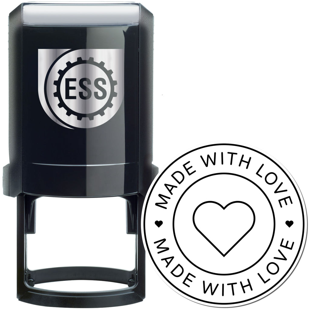 Available in a convenient 1-5/8" round size, this stamp features a charming design that includes the phrase "made with love" encircling a big heart, with tiny hearts in between. Its simple black and white color scheme ensures that your message is both clear and elegant, making it ideal for business mail, custom invitations, or personal thank you notes.