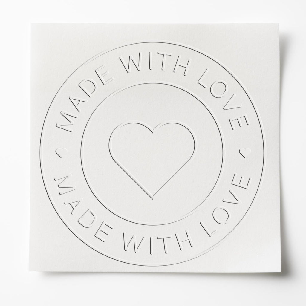 Crafted for durability and elegance, our embossers are not just tools; they are a statement piece for your desk or workspace. The sleek, modern circular design features "made with love" looping twice around the edge, accented by charming heart icons, and a bold heart at the center. This minimalist flair in crisp black lines adds a touch of sophistication to your professional environment.