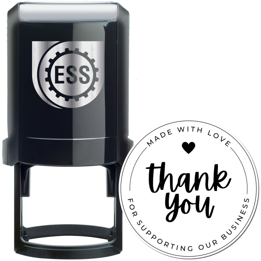 Make every package and note unforgettable with our Heartfelt Gratitude Self-Inking Personalized Thanks Stamp. This professional-grade 1-5/8" round stamp features an elegant design with "MADE WITH LOVE" at the top, a beautifully scripted "thank you" in the center, and "FOR SUPPORTING OUR BUSINESS" at the bottom, complete with a charming heart accent.