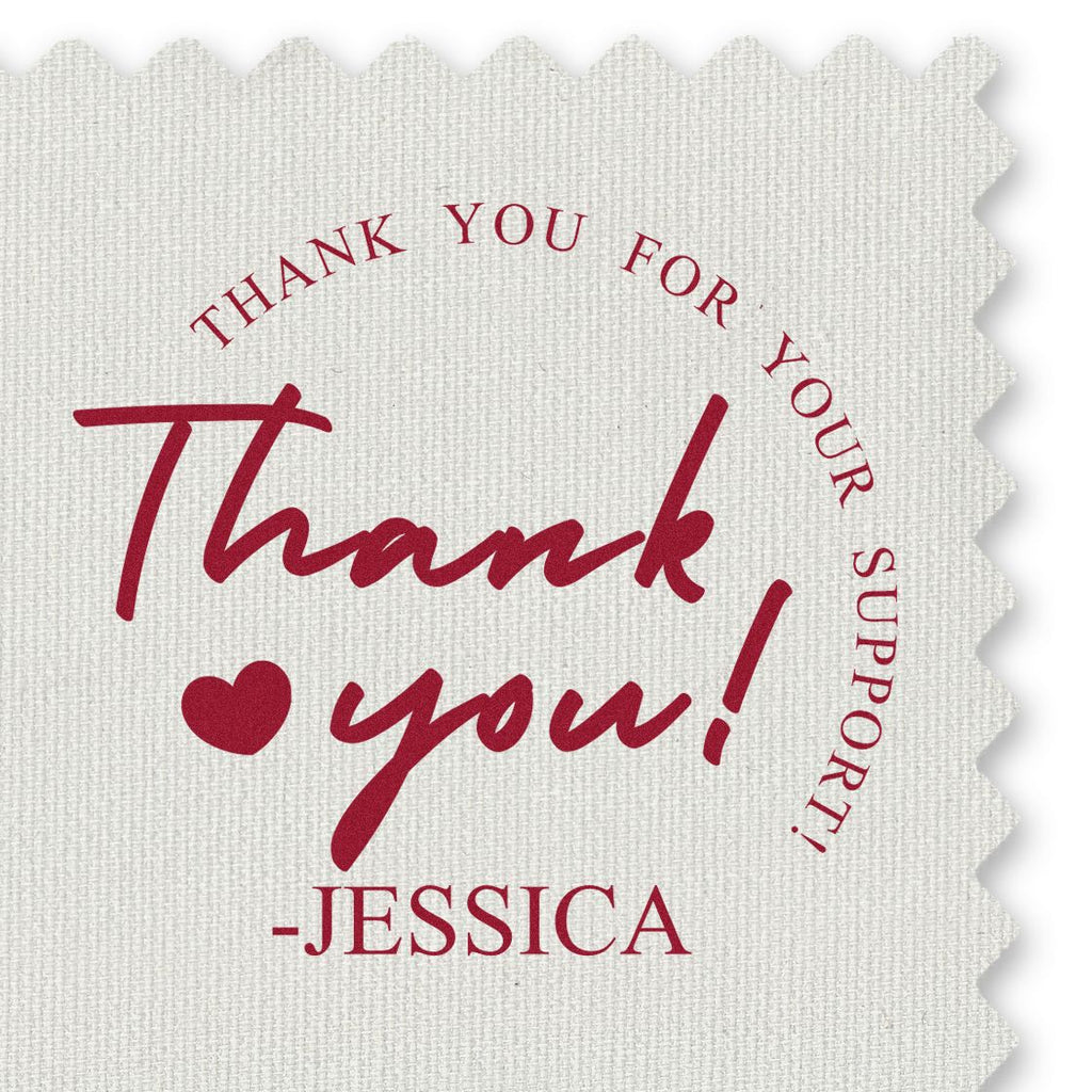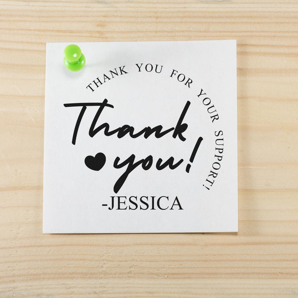 Crafted with cutting-edge laser engraving technology, this 1-5/8" round stamp ensures every impression is sharp and professional, making your projects truly shine. The design features "thank you for your support!" in a fancy, old-fashioned style at the top and bottom, with a bold, handwritten "thank you!" in the center, accompanied by a charming heart. Personalize it with "Jessica" at the bottom for a special touch.