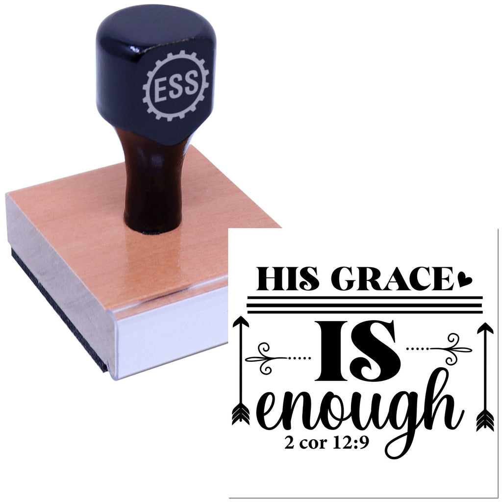 Briskly designed, the “HIS GRACE” phrase sits in bold uppercase above a centered “IS” with decorative flourishes, while the script “enough” and the reference 2 Cor 12:9 tuck neatly beneath. Beautiful balance, timeless allure, and instant familiarity in every stamp.