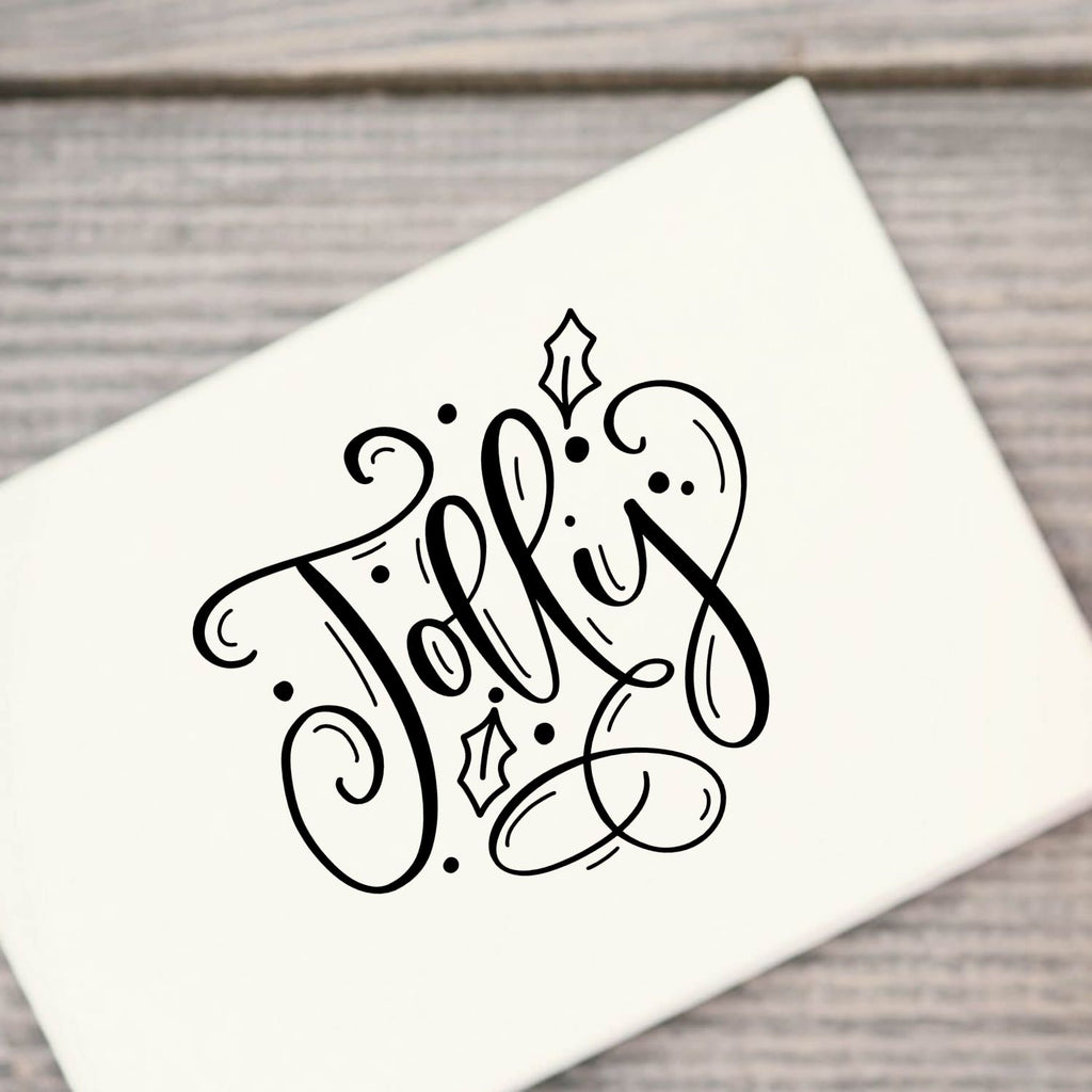 Plenty of festive appeal: “Jolly” is hand-lettered in bold, flowing script with looping flourishes, surrounded by holly leaves and berries for a crisp, cheerful look. Pristine black lines on white ensure standout clarity on any project.