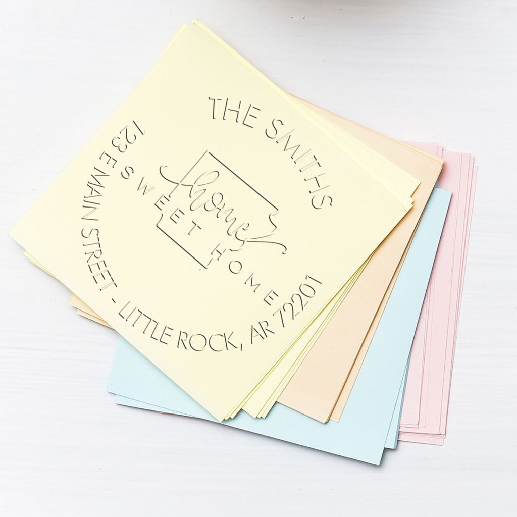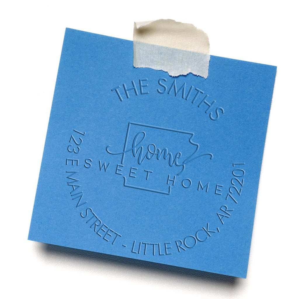 Featuring a beautifully designed Arkansas state outline with elegant script "home" lettering and bold "SWEET HOME" text, this embosser creates crisp, raised impressions that make your return address truly memorable. The perfect blend of state pride and personal style, each impression leaves a professional, three-dimensional mark that elevates your correspondence.