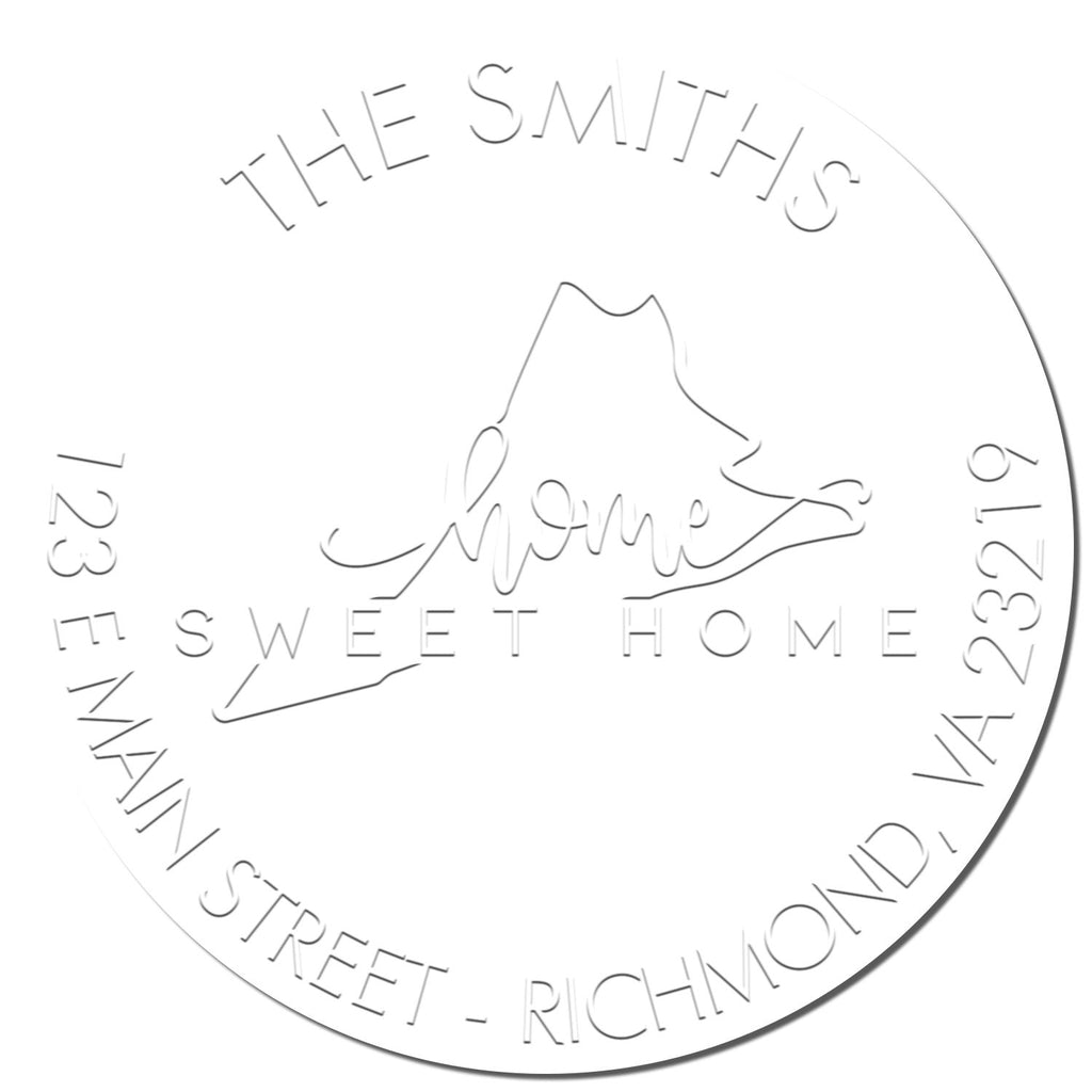 Transform your everyday mail into a statement of Virginia pride with our exquisite Home Sweet Home Desk Handcrafted Mailing Address Embosser. This premium 1-5/8" round embosser features a meticulously crafted design showcasing the beloved shape of Virginia, with elegant "home" script nestled within and bold "SWEET HOME" text beneath – a perfect blend of state pride and personal style.