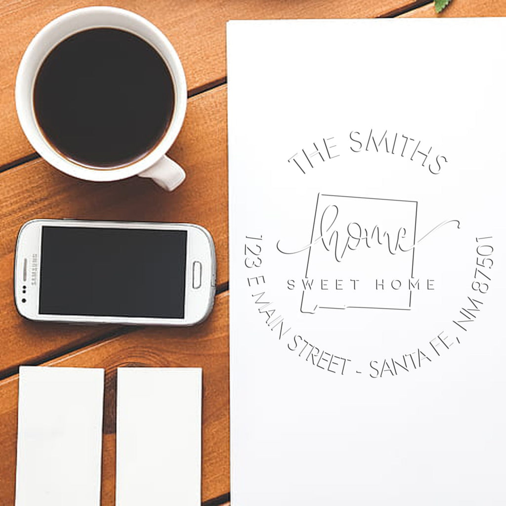 Make Your Mark with New Mexico Pride - Introducing our Home Sweet Home Personalized Return Address Embosser Seal, a perfect blend of state pride and professional elegance. This 1-5/8" round embosser features a stunning silhouette of New Mexico with graceful cursive "home" nestled within, complemented by bold "SWEET HOME" text.