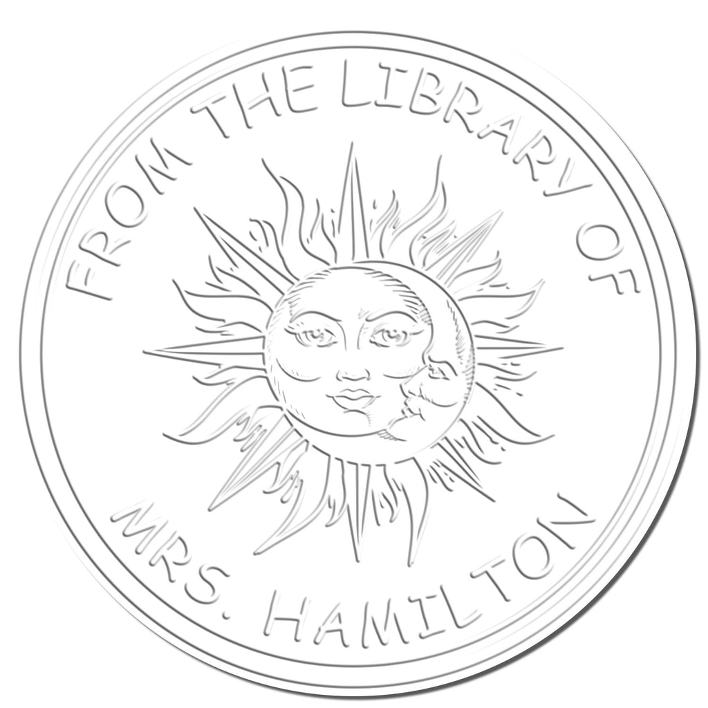 Transform Your Library Today! Our book embossers are more than just a mark of ownership; they are your gateway to a world where every book in your collection receives the royal treatment it deserves. The design features a captivating center image of a Bewitching Sky Sun with a face, surrounded by a double concentric solid circular border. The words "From The Library of" grace the top arc, while the bottom arc proudly states "Read it, Love it, Return it." With an impression size of 1-5/8" in diameter, this embosser is the perfect size to make a statement without overwhelming your book's pages.
