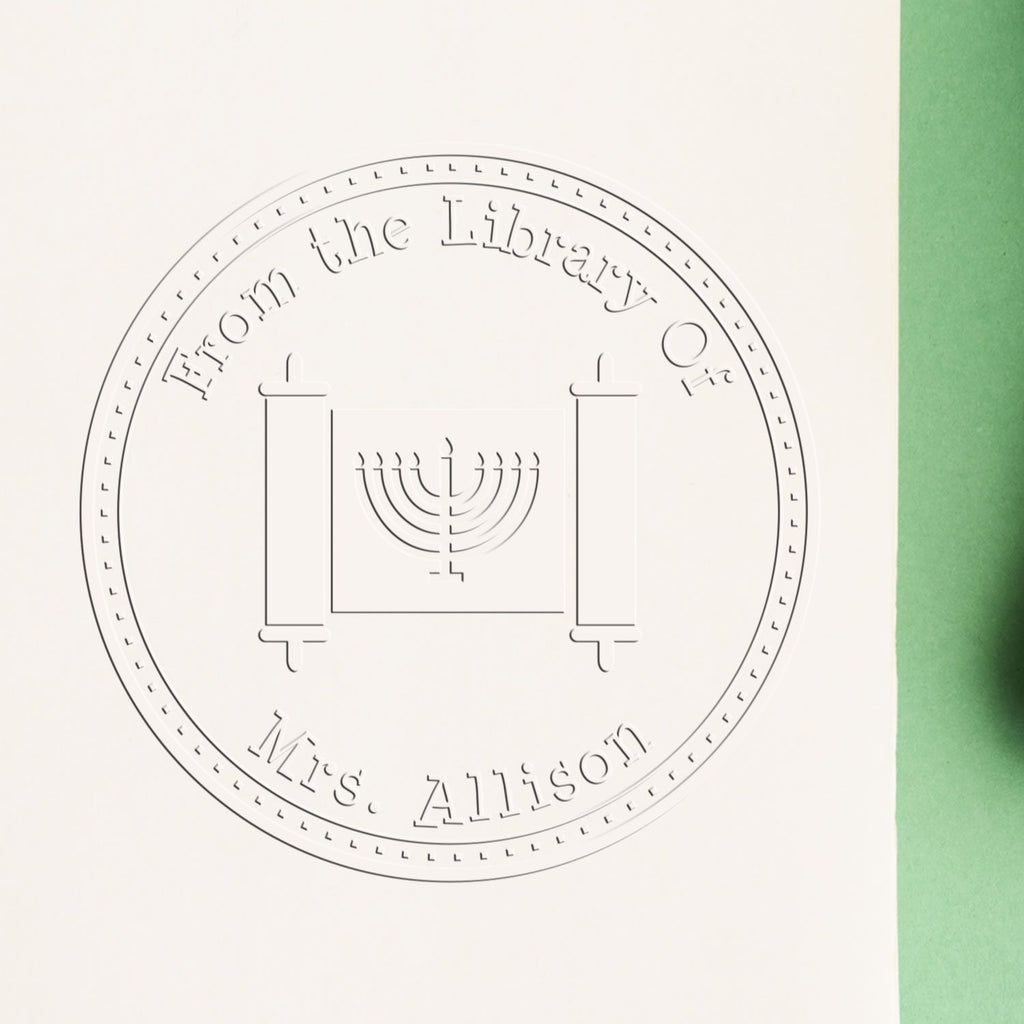 Durability You Can Trust Crafted from high-quality materials, our embosser is built to last. You can rely on it for consistent, clear impressions every time you use it. The impressive design features a center image of a Blessed Torah open scroll, surrounded by a three-ring border that includes phrases like "This Book Belongs To," "From The Library of," and "Ex Libris" at the top arc, followed by your name or a personal saying at the bottom arc. The impression size is a perfect 1-5/8" in diameter, making it ideal for a variety of documents.