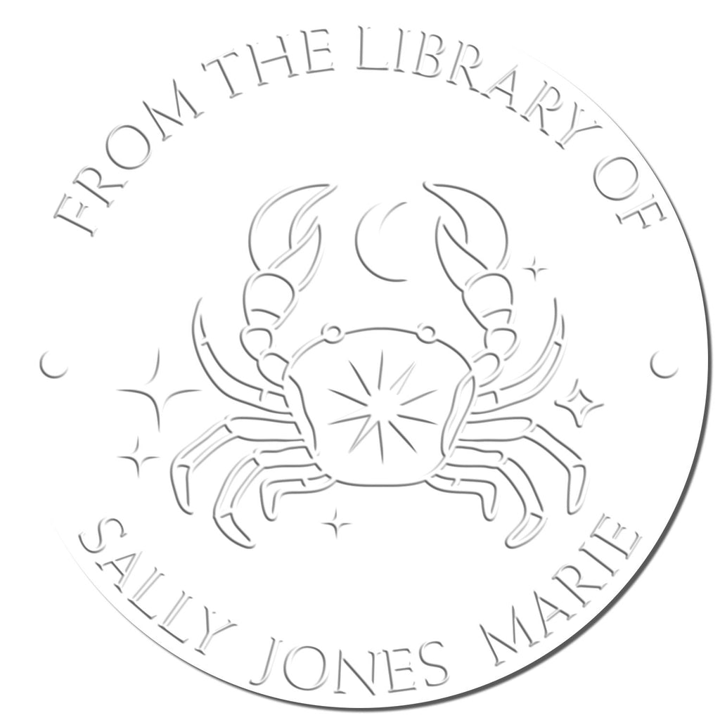 Astrology Meets Literature This embosser features a charming design with a pinching crab, the zodiac symbol of Cancer, at the center. The clean round design includes phrases such as "This Book Belongs To," "From The Library of," or "Ex Libris" at the top arc, followed by your name or another saying at the bottom arc, separated by two dots in the center. It’s a beautiful way to merge your love for astrology with your passion for reading!