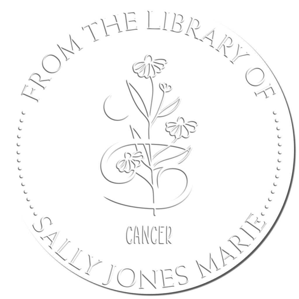 Personalize Your Library With an impression size of 1-5/8" in diameter, this library stamp features a center image of the Cancer Zodiac Symbol with Flowers. The design includes phrases such as "This Book Belongs To," "From The Library of," and "Ex Libris" at the top arc, followed by your name or a special saying at the bottom arc, separated by a line of dots. This personalization elevates every book in your collection, making them uniquely yours.