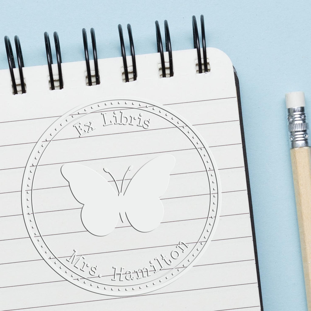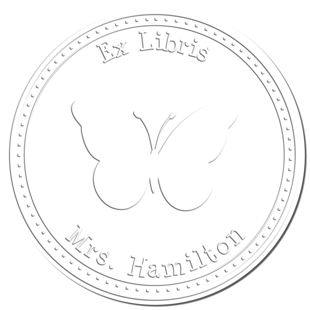 Impress with Every Page Imagine transforming your book collection into a showcase of sophistication. With our premium book embosser, you can imprint a beautiful, raised design that brings a level of class and refinement to your books that ink stamps simply can’t match. The impression size of 1-5/8" in diameter features a stunning center image of a colorful butterfly, surrounded by a three-ring border and phrases such as "This Book Belongs To," "From The Library of," and "Ex Libris". Personalize it with your name or a special saying at the bottom arc, making each book uniquely yours.