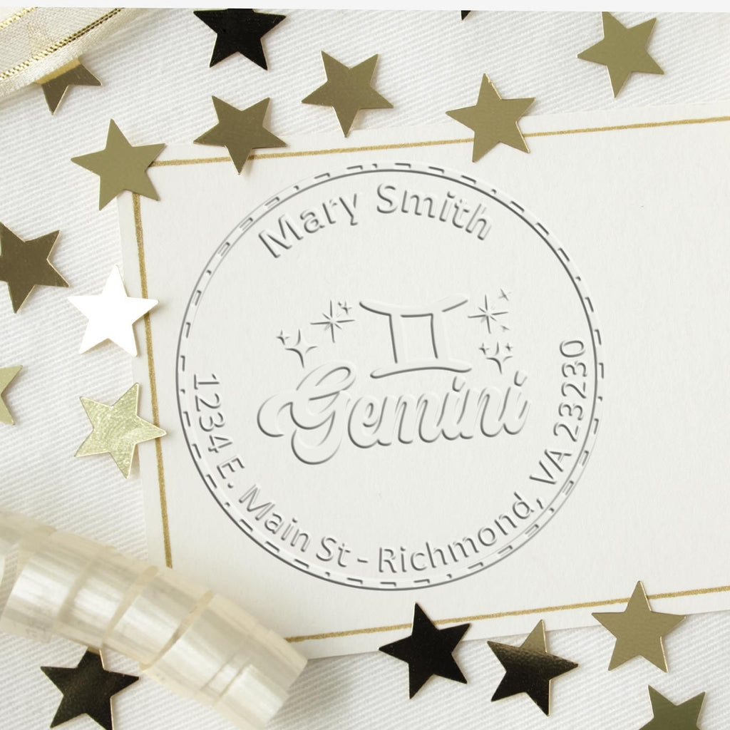 - ELEVATE YOUR CORRESPONDENCE Transform your letters and cards with our Personalized New Home Embosser, adding a touch of elegance and uniqueness to every piece of mail you send. Impress your friends and family with a refined Gemini Zodiac design that showcases your personality.