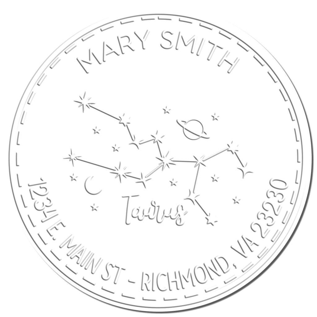 Superior Quality and Design Our hybrid seal embossers are engineered to deliver a superior and crisp impression every time. With an impressive 1-5/8" diameter, the Taurus Constellation design features a stunning celestial motif, complete with planets, moons, and stars, all encircled by a double ring border. Your name elegantly arcs at the top, while your address or a personalized message graces the bottom, making it a truly custom piece that reflects your unique style.