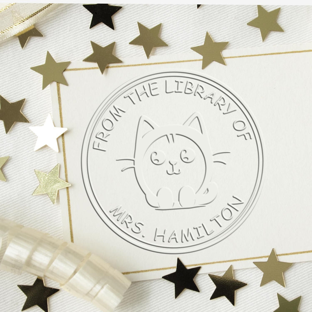 - PERSONALIZE WITH PRIDE: Elegant 1-5/8" diameter embossed seal featuring an adorable kitty design, perfect for cat-loving bibliophiles. Creates a lasting raised impression that won't fade or smudge like traditional stamps.