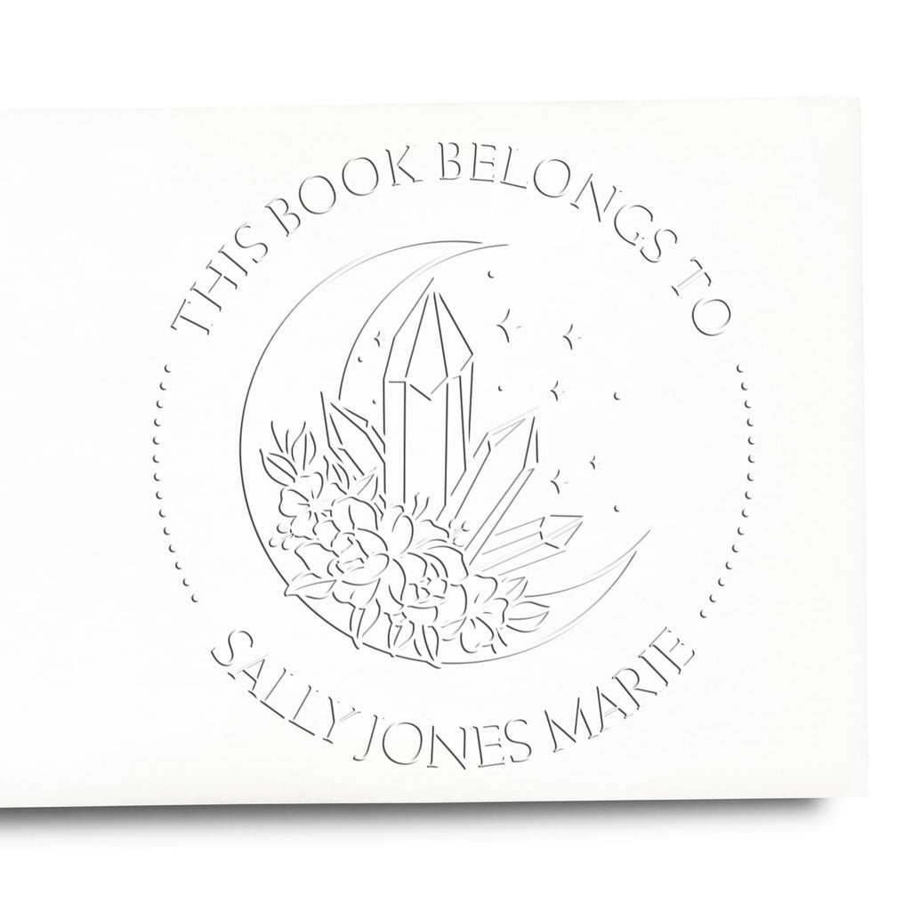 Unleash Your Creativity with Stunning Design Our embosser features a captivating center image of a Dazzling Celestia Moon surrounded by enchanting flowers and crystals, creating a mesmerizing impression that will leave a lasting mark on your books. The clean round design includes phrases such as "This Book Belongs To," "From The Library of," and "Ex Libris" elegantly displayed in the top arc, with your name or a personalized saying beautifully showcased in the bottom arc. The separation of the text by a line of dots adds a sophisticated touch, making each impression a work of art.