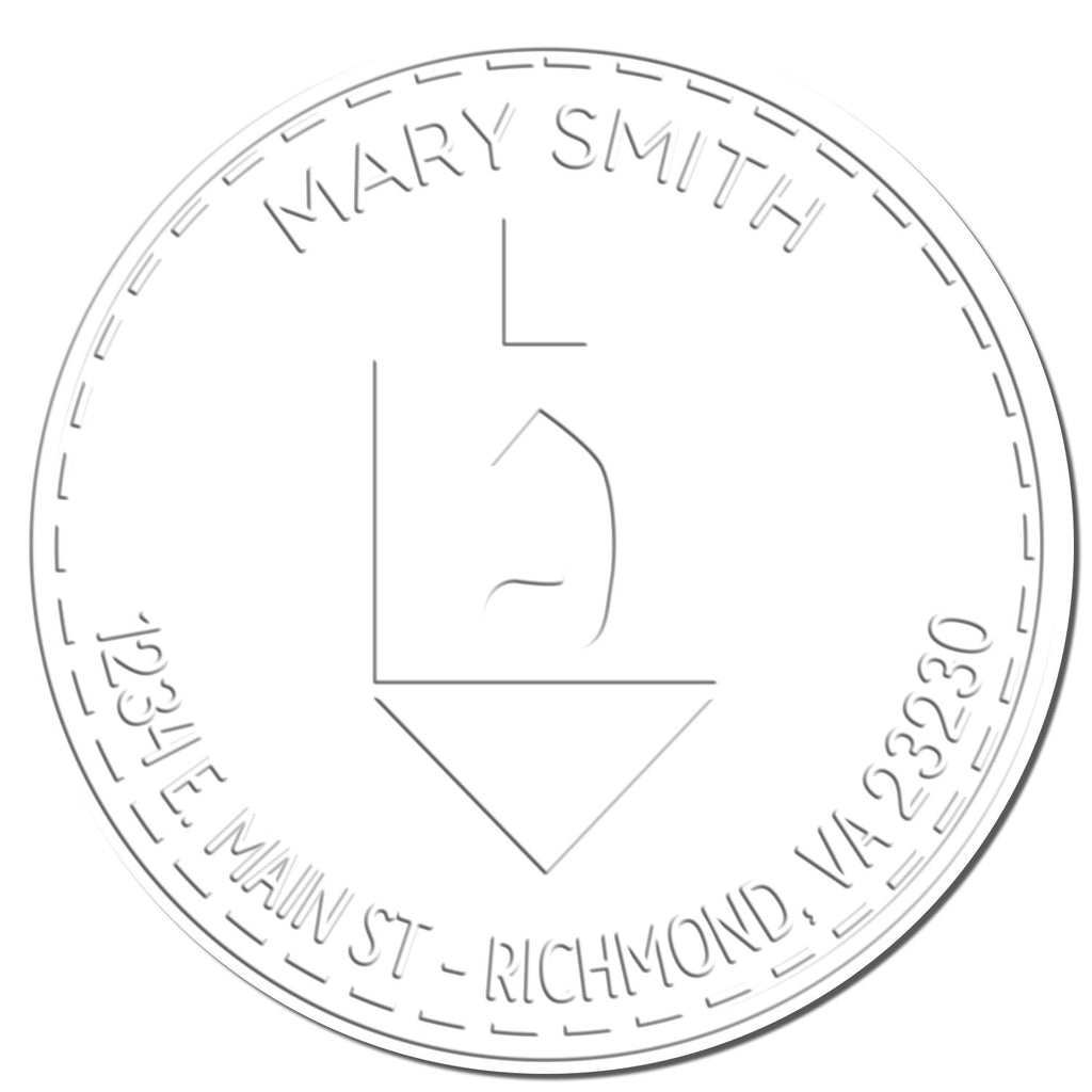 Exceptional Design and Quality Our round address embosser features a beautifully crafted center image of a Divine Dreidel, surrounded by a double ring circular border that combines a solid outer line with a dashed inner line. Your name elegantly arcs at the top, while your address or a special saying graces the bottom arc. With an impression size of 1-5/8" in diameter, this embosser creates a balanced and symmetrical look that is both classic and versatile, making it a perfect addition to any stationery collection.