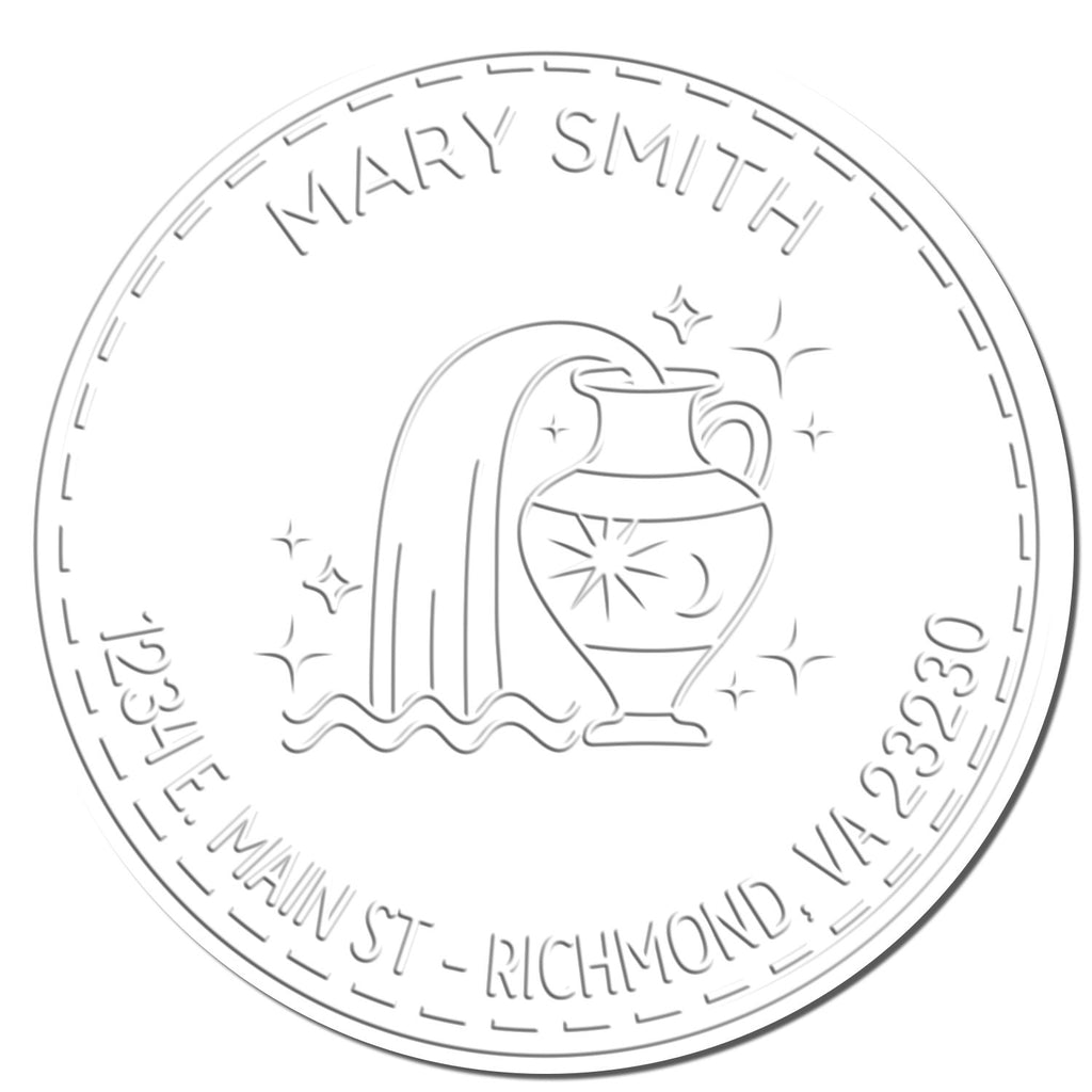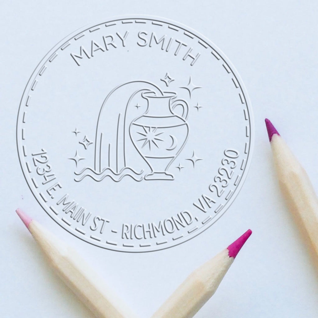 Elevate your mail game with our stunning Hybrid Eccentric Aquarius Custom Home Address Embosser! This unique and stylish tool is not just an embosser; it’s a statement piece that adds a touch of sophistication and personality to your correspondence. Featuring a beautifully designed zodiac motif, this embosser showcases a vase with flowing water, symbolizing the essence of Aquarius. With a double ring circular border and your name elegantly displayed in the top arc, followed by your address or a personalized saying at the bottom, this embosser is the perfect blend of functionality and artistry.