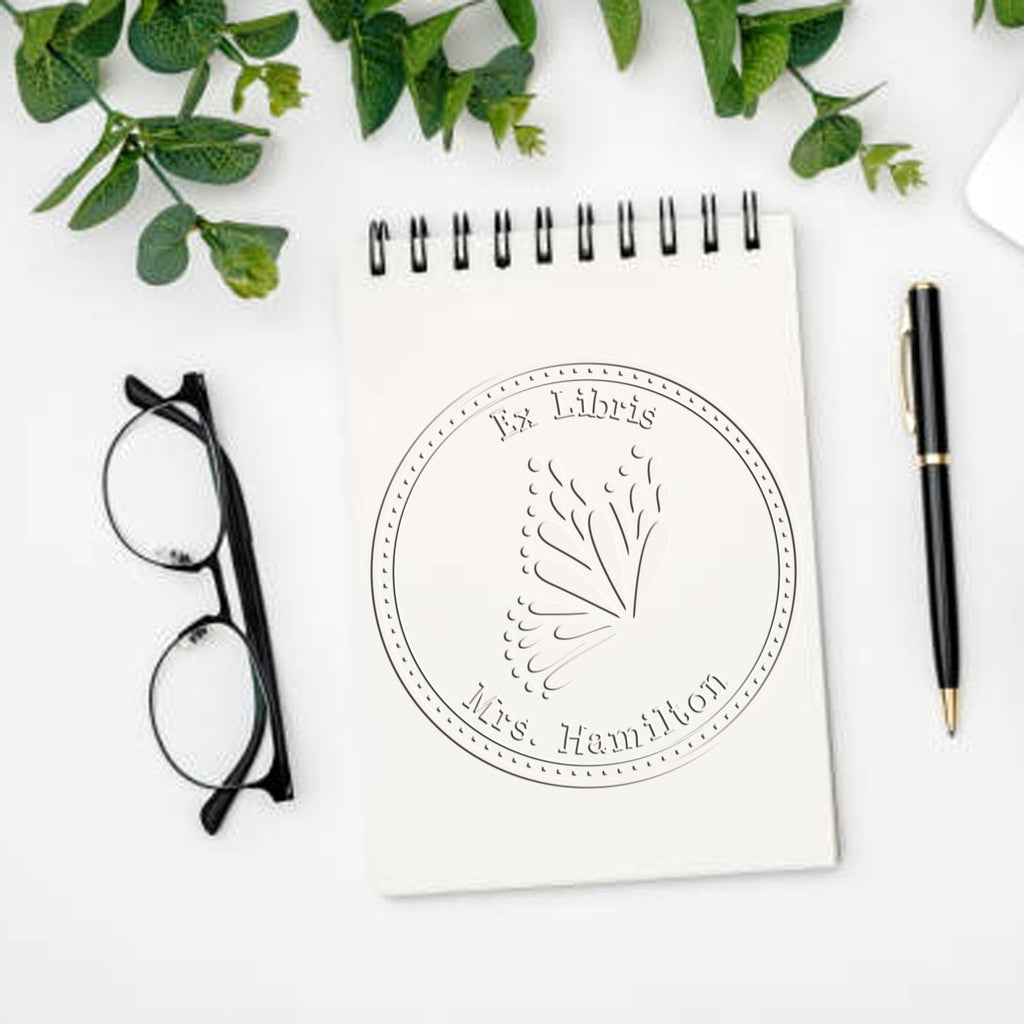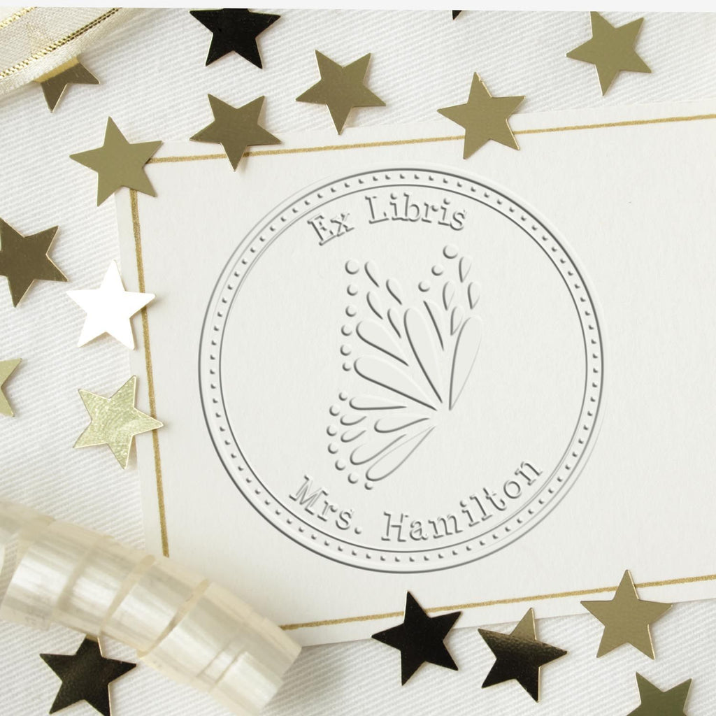 - DISTINCTIVE DESIGN Features an elegant butterfly motif surrounded by three sophisticated border rings, customizable with phrases like "Ex Libris" or "From The Library Of" plus your personalized text.