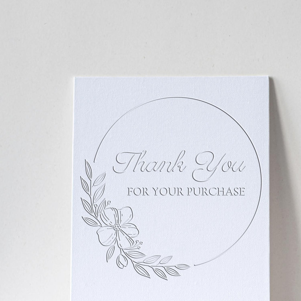 Crafted with meticulous attention to detail, our seal features an enchanting floral design with delicate cursive and serif fonts spelling "thank you for your purchase." The sophisticated open border and intricate flower motif add a touch of timeless elegance to every impression.
