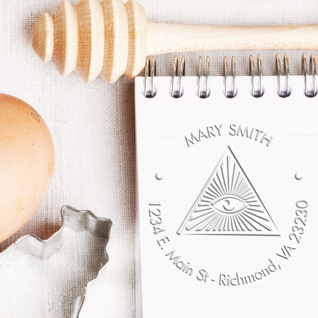 Stylish and Personalized Let’s talk style! Choose between a sleek black or a playful pink handle to match your personality. With our hybrid seal embossers, you don’t just emboss—you make an impression! The design features a stunning center image of the Elusive Masons all-seeing eye symbol, surrounded by your name in the top arc and your address or a personal saying in the bottom arc, separated by two elegant dots. The impression size is a perfect 1-5/8" in diameter, making it ideal for a variety of uses.
