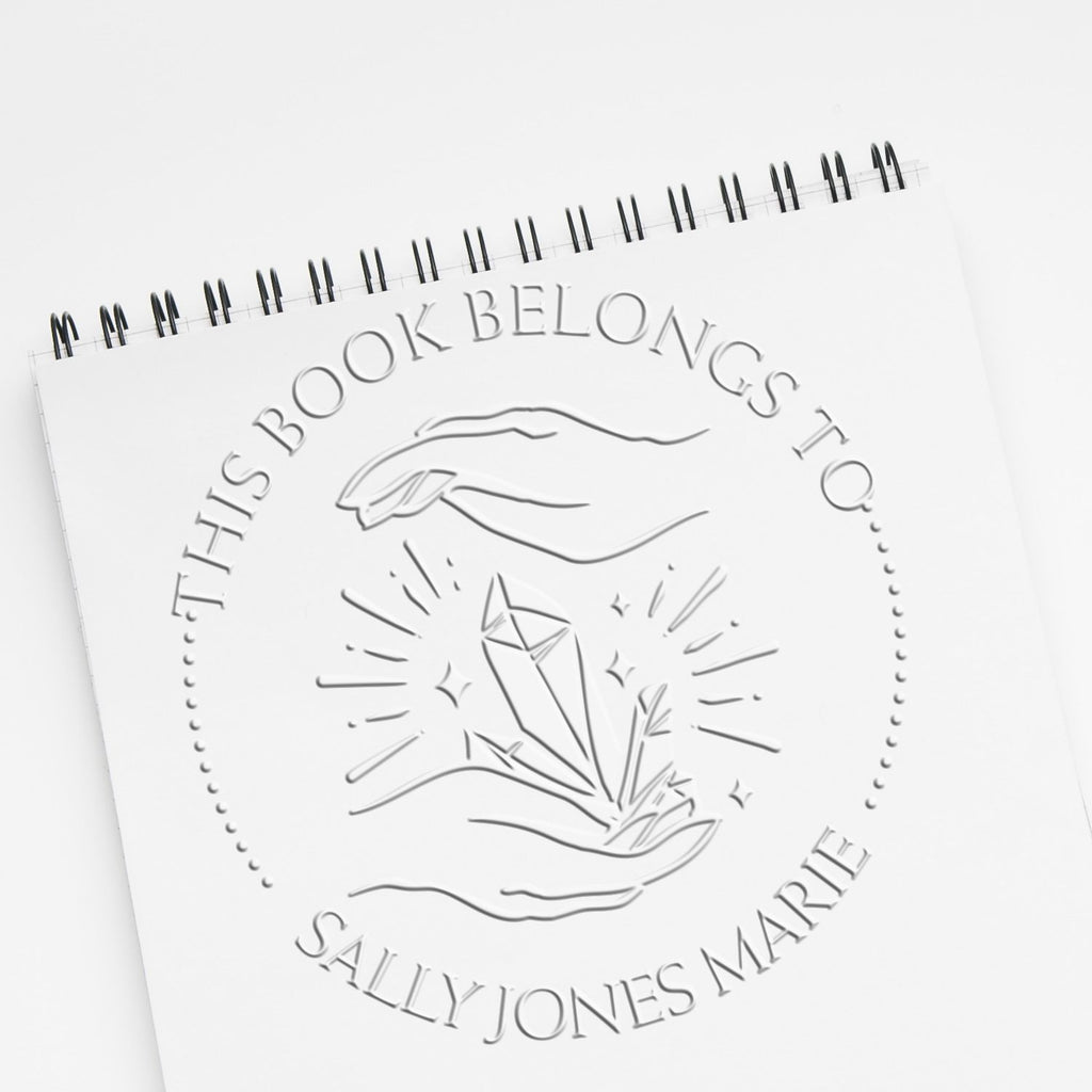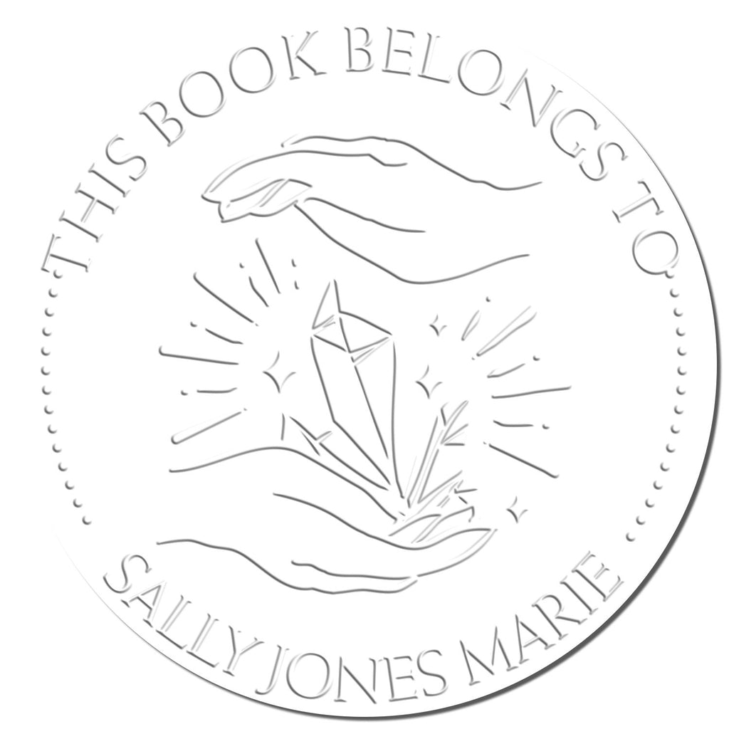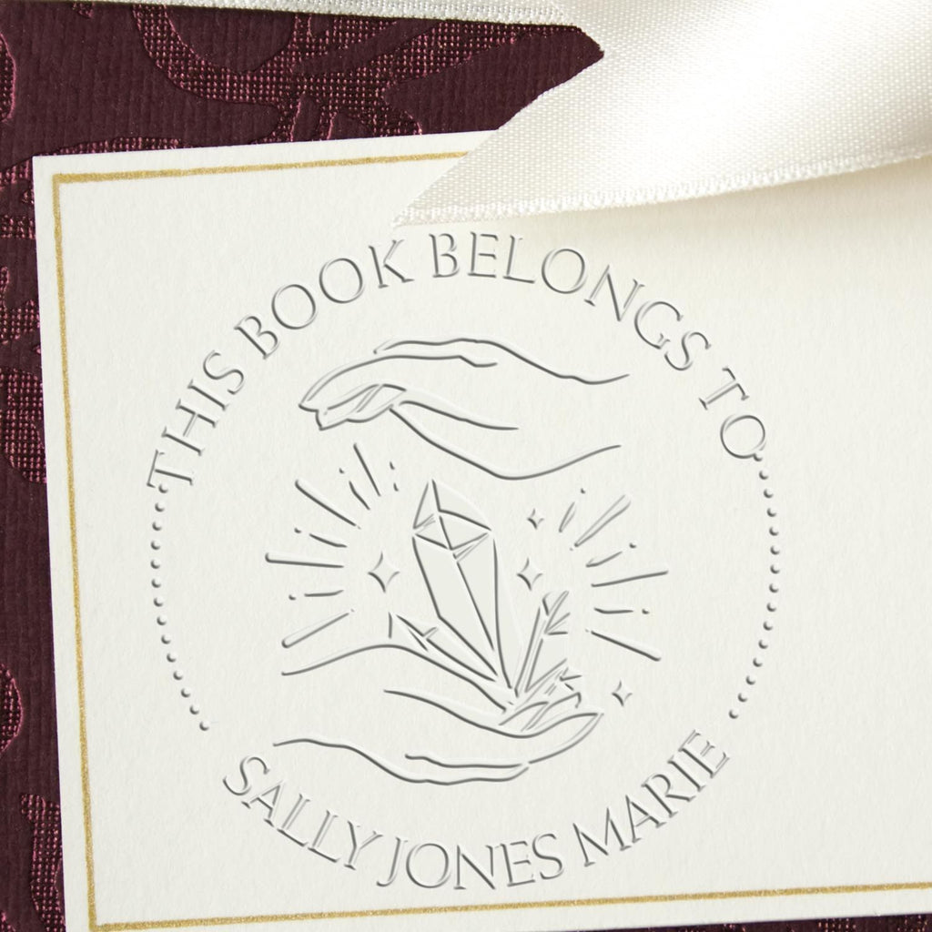 Transform Your Library into a Showcase of Elegance With our premium book embossers, you can easily brand and organize your books with style. The unique design features a center image of Enigmatic Energy Crystals being cupped by two hands, surrounded by phrases such as "This Book Belongs To," "From The Library of," and "Ex Libris" at the top arc, followed by your name or another saying at the bottom arc. The top and bottom arc texts are elegantly separated by a line of dots, adding a touch of sophistication to your embossed mark.
