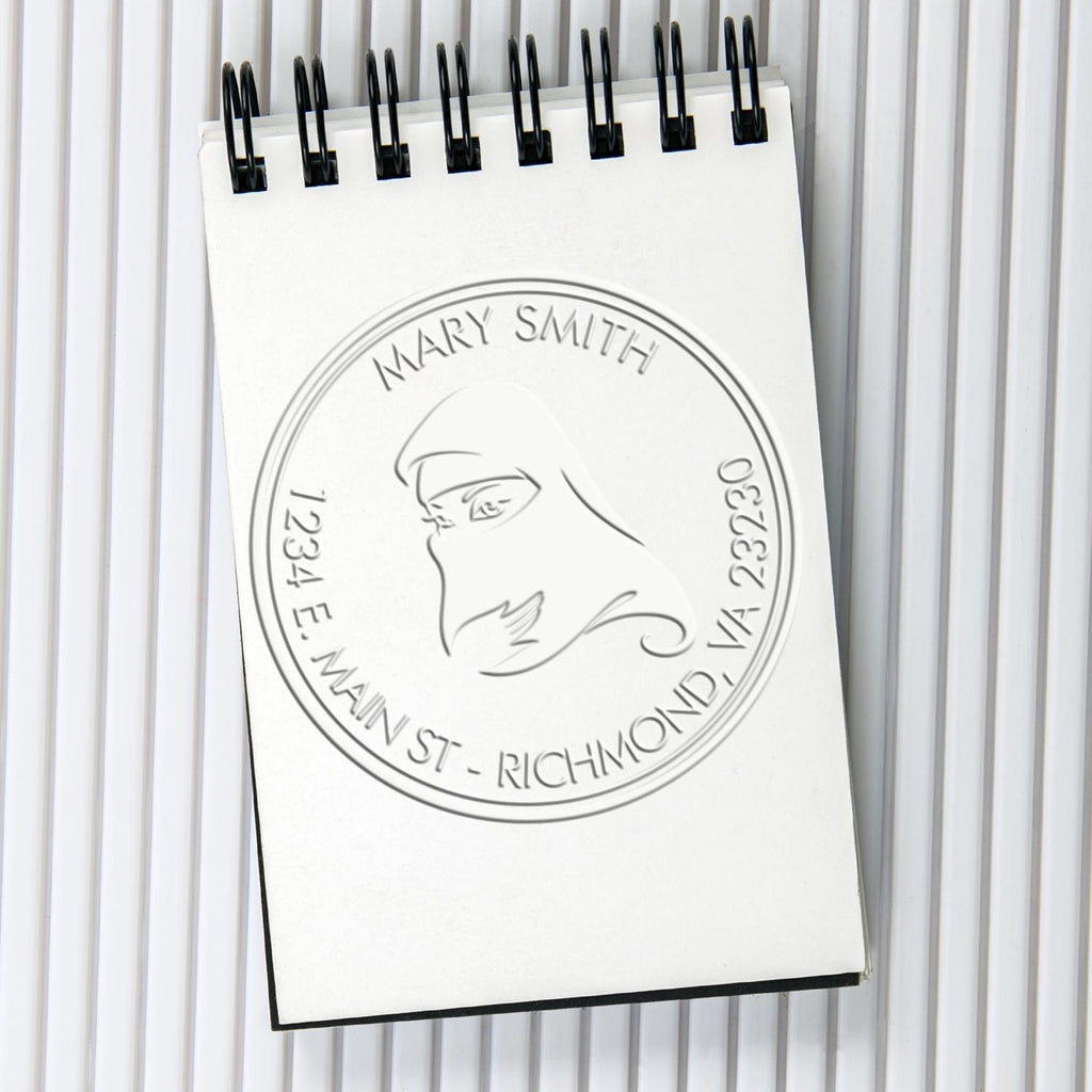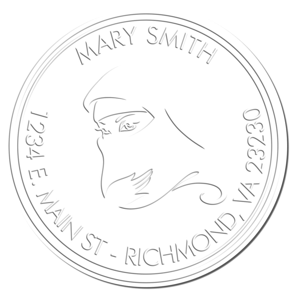 Customize Your Embosser For those who want their address to reflect a unique identity, our personalized address embosser offers customization with names, fonts, and designs. The impression size is a perfect 1-5/8" in diameter, making it ideal for envelopes, stationery, and more. The design features a double concentric solid circular border with your name elegantly displayed in the top arc and your address in the bottom arc, all beautifully framed by the eye-catching veil woman in the center.