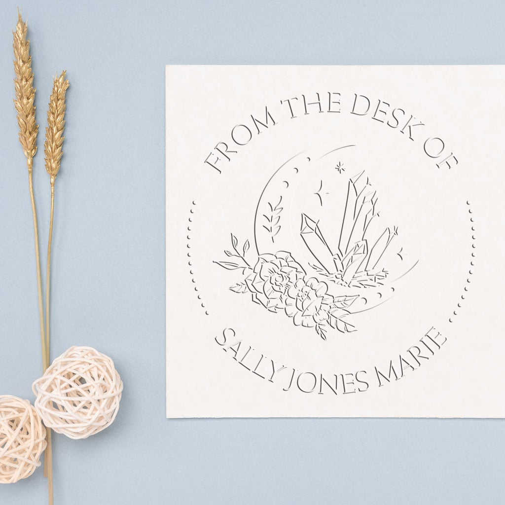 Unleash Your Creativity with Customization Imagine your favorite books adorned with a stunning embossed seal that reads "This Book Belongs To" or "From The Library of" followed by your name or a special saying. Our embosser features a captivating design of a Fantastical Moon surrounded by Mystic Crystals, making it a true work of art. The clean round design, with its elegant top arc and bottom arc separated by a line of dots, ensures that your personalized message stands out beautifully. With an impression size of 1-5/8" in diameter, your books will not only be marked with ownership but will also exude sophistication and charm.