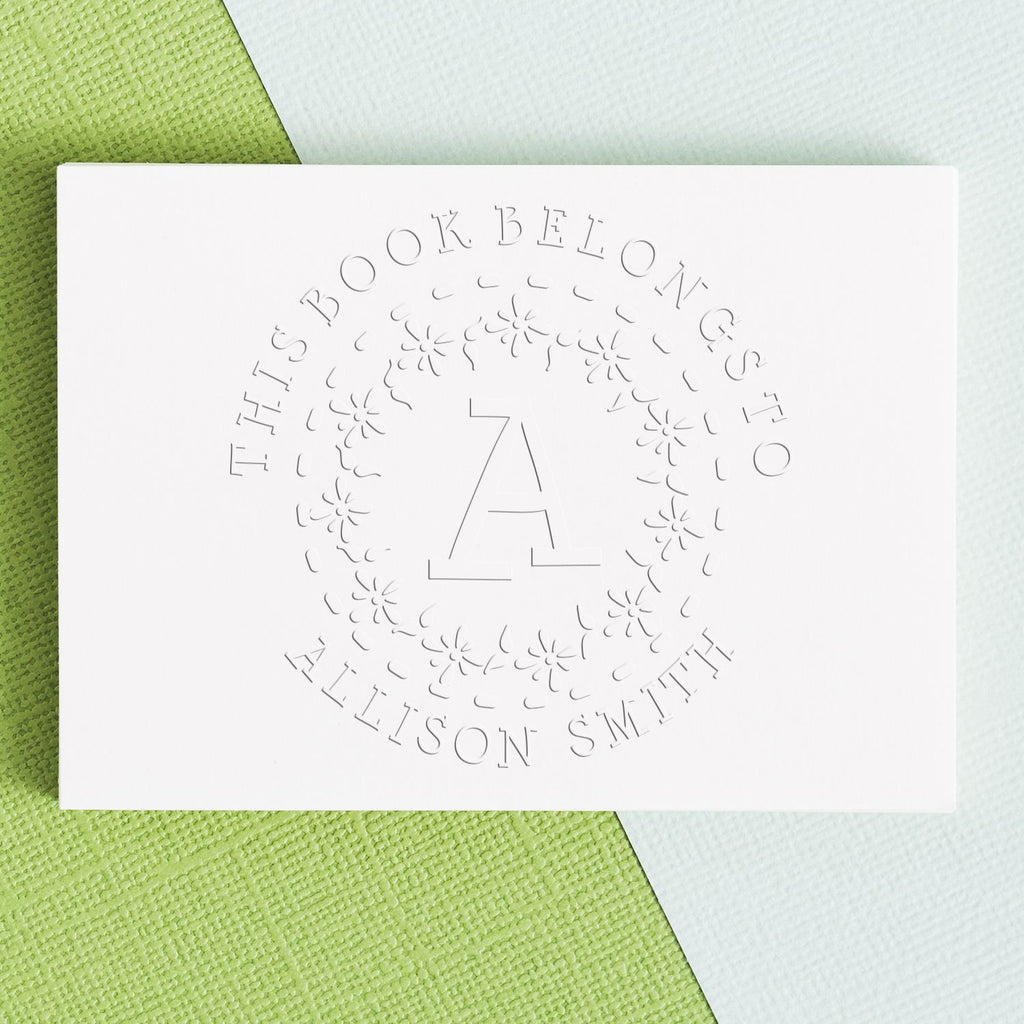 Crisp Impressions, Effortless Style Imagine the delight on a young reader's face when they discover their name elegantly embossed on their very own book! Our embossers not only mark ownership but also foster a love for reading, instilling pride and responsibility in every child. With an impressive impression size of 1-5/8" in diameter, this library stamp features a stunning center image of a monogram surrounded by a beautiful floral design. The clean round design includes phrases such as "This Book Belongs To," "From The Library of," and "Ex Libris" at the top arc, followed by your name or a personalized saying at the bottom arc.