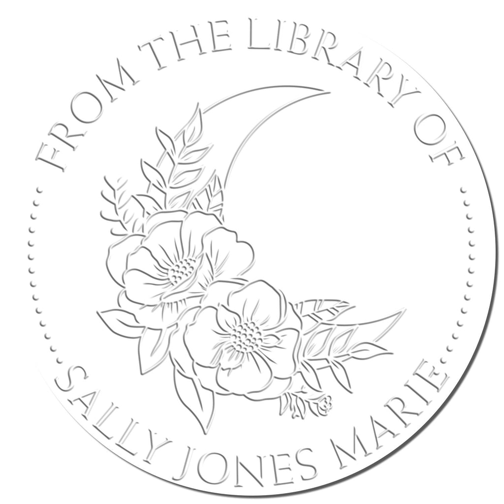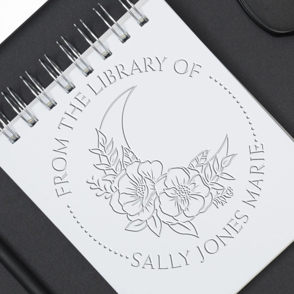 Unmatched Precision and Style Imagine the satisfaction of seeing your name elegantly embossed on the first page of your favorite book. Our seal press features a beautifully crafted design with a center image of a Gentle Moon surrounded by delicate flowers. The clean round design includes phrases like "This Book Belongs To," "From The Library of," or "Ex Libris" at the top arc, followed by your name or a custom saying at the bottom arc, separated by a charming line of dots. With an impression size of 1-5/8" in diameter, your personalized touch will stand out beautifully on every book!