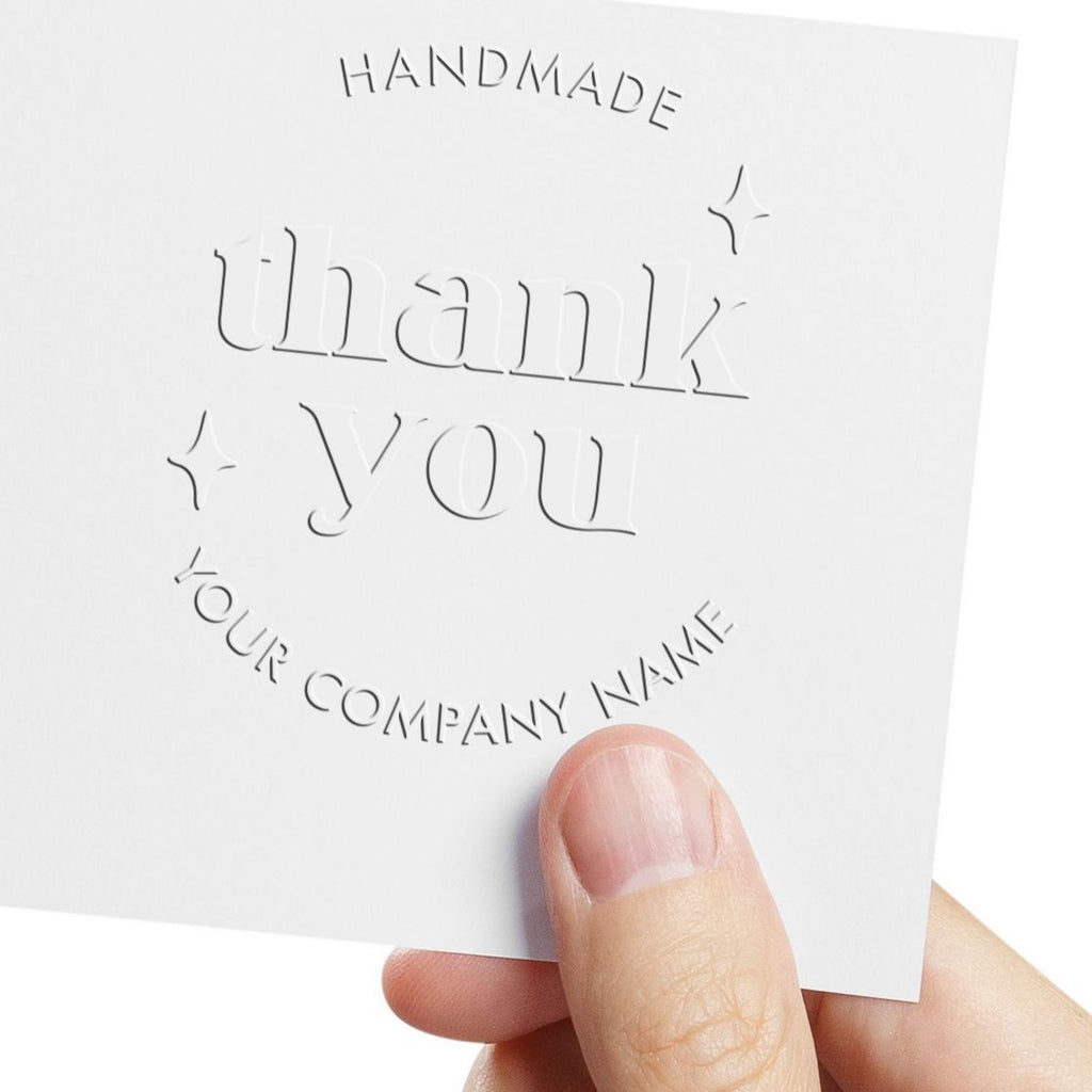 Elevate your brand's personal touch with our exquisite Hybrid Handmade Gratitude Seal Customizable Thanks Stamp Embosser. This premium 1-5/8" round embosser combines elegance and functionality, featuring a sophisticated design that includes "Thank You" in bold serif font, complemented by "Handmade" and your custom company name in modern sans-serif lettering, adorned with stylish star accents.