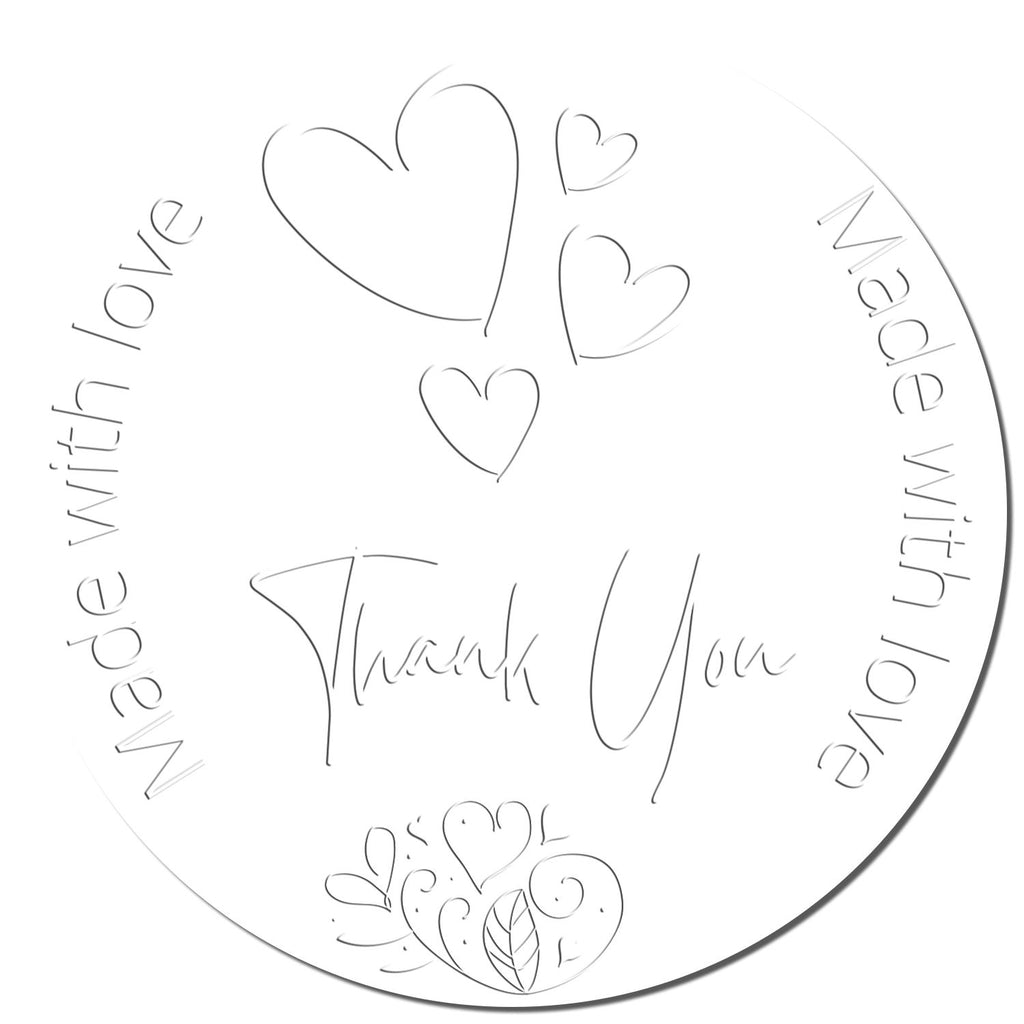 Featuring a sophisticated 1-5/8" round design, this embosser showcases a beautifully scripted "thank you" message encircled by "made with love," complemented by charming hearts and delicate leaf accents. The result? A stunning, professional-grade embossed seal that transforms ordinary correspondence into memorable keepsakes.