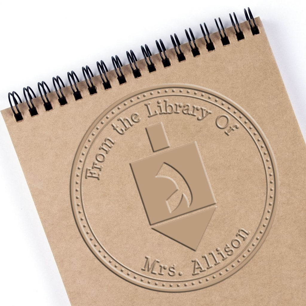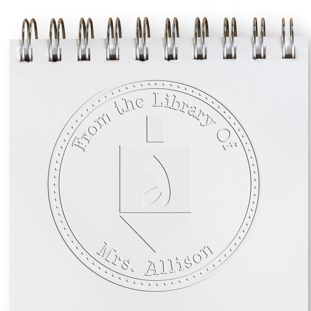Impressive Design and Personalization This stunning embosser features a delightful center image of a Holiday Dreidel, surrounded by a three-ring border that adds a touch of sophistication. The solid bold circular border, paired with a dotted inner border, creates a beautiful frame for your personalized message. With phrases like "This Book Belongs To," "From The Library of," and "Ex Libris" elegantly displayed at the top arc, you can customize the bottom arc with your name or a special saying. The impression size of 1-5/8" is perfect for making a lasting impression on your books, cards, and gifts.