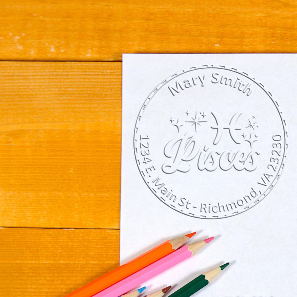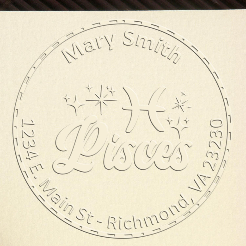 Product Specifications: - Impression Size: 1-5/8" in diameter - Design: Features a Pisces Zodiac Symbol with the word "Pisces" in a scripted font, surrounded by a solid circle border filled with white dashes and dots. Your name is elegantly displayed in the top arc, with your address or another saying at the bottom arc.